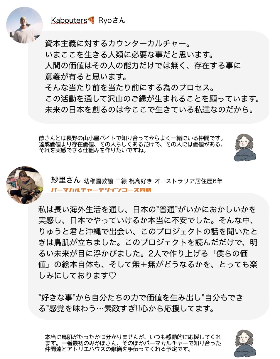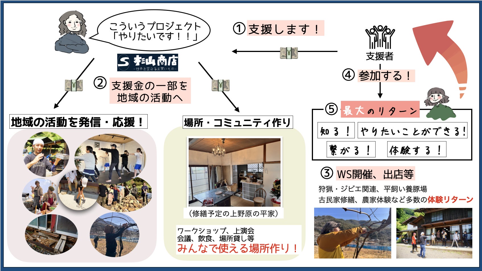 1000円からでも、体験リターン目的でも、なんでも構いません。あなたの支援してくれたお金は、僕が責任を持って人の役に立て、あなたに還元される仕組みづくりに使います。絵本以上の支援ができる方であれば、それが地域の仲間に還元されます。あなたの手伝える範囲で構いません。