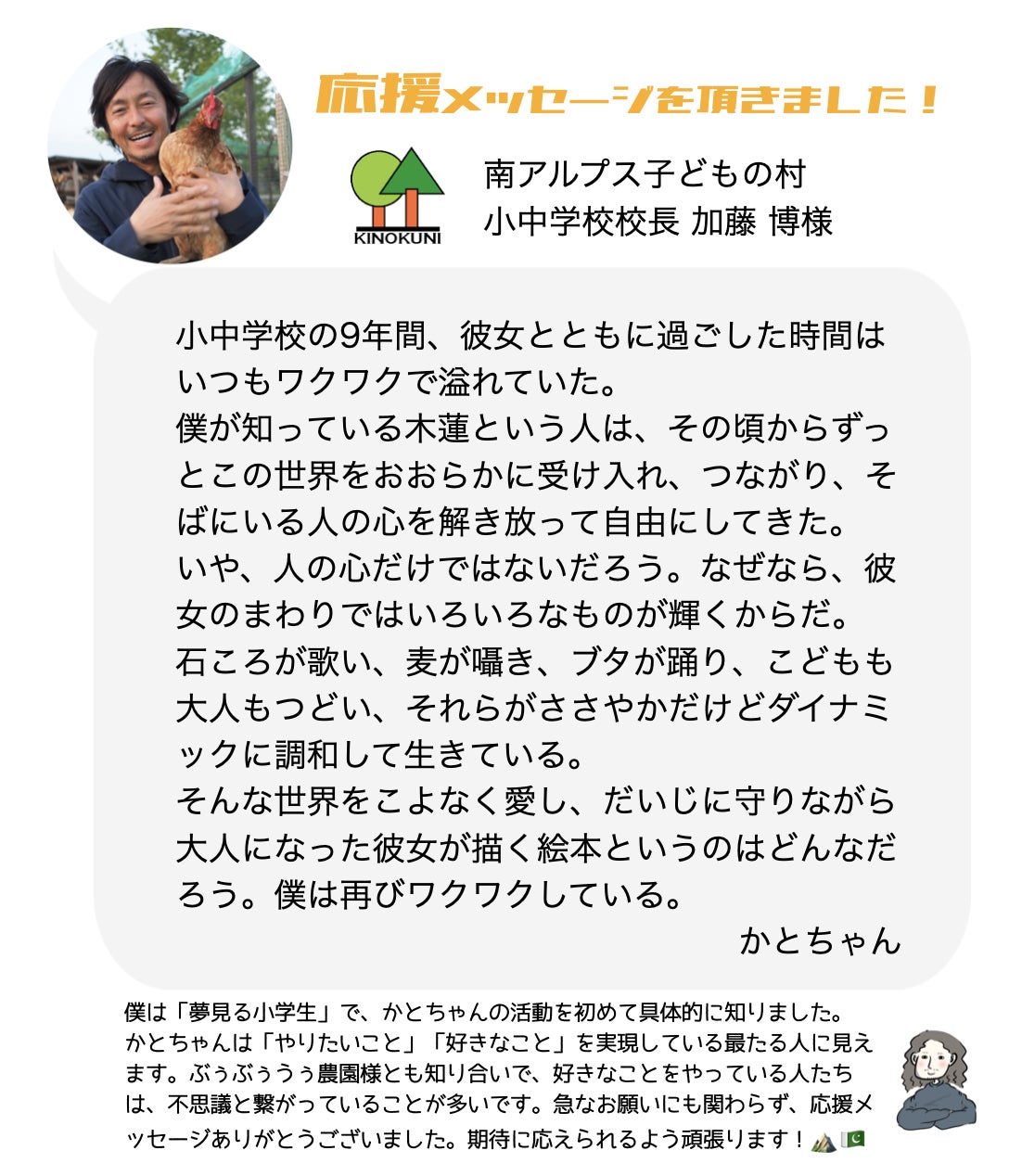 木蓮は素敵な感性を持ったまま大人になれた、そんな子です。そして木蓮の卒業校の校長先生、南アルプス子どもの村 加藤校長先生より、応援メッセージいただきました。