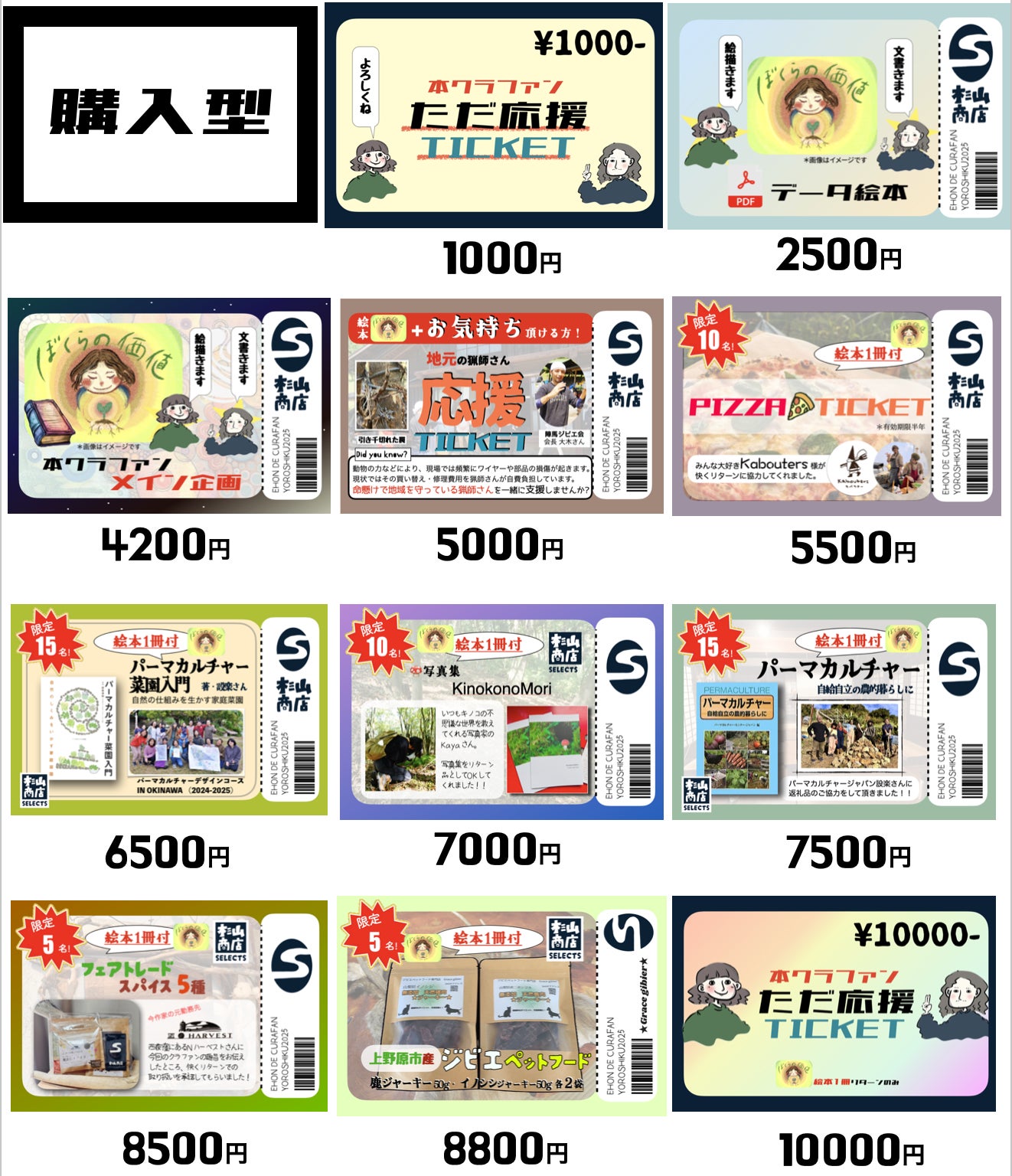 絵本作りと同時並行で地域の活動やプレイヤーの方々(狩猟のわな体験、平飼い養豚場、古民家修繕、地元のジビエペットフード、パーマカルチャーの本、キックボクシング、、、)の支援も行えたらと思い、支援金枠で様々な方のリターン(という名の応援)を揃えました。