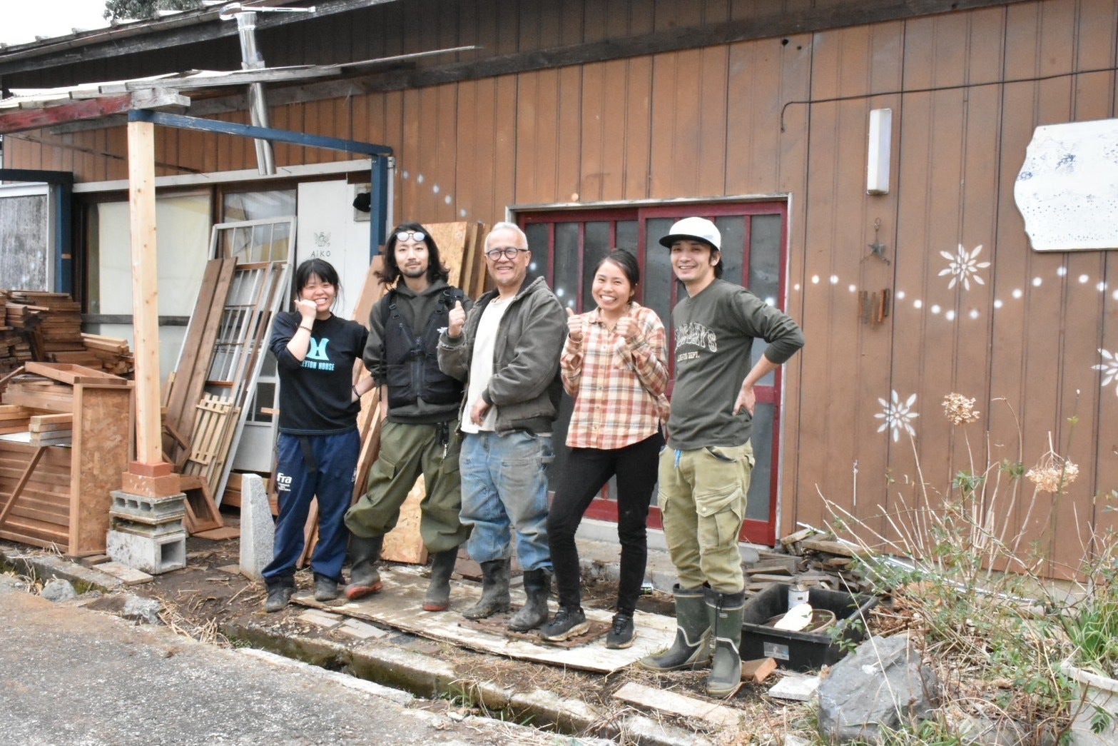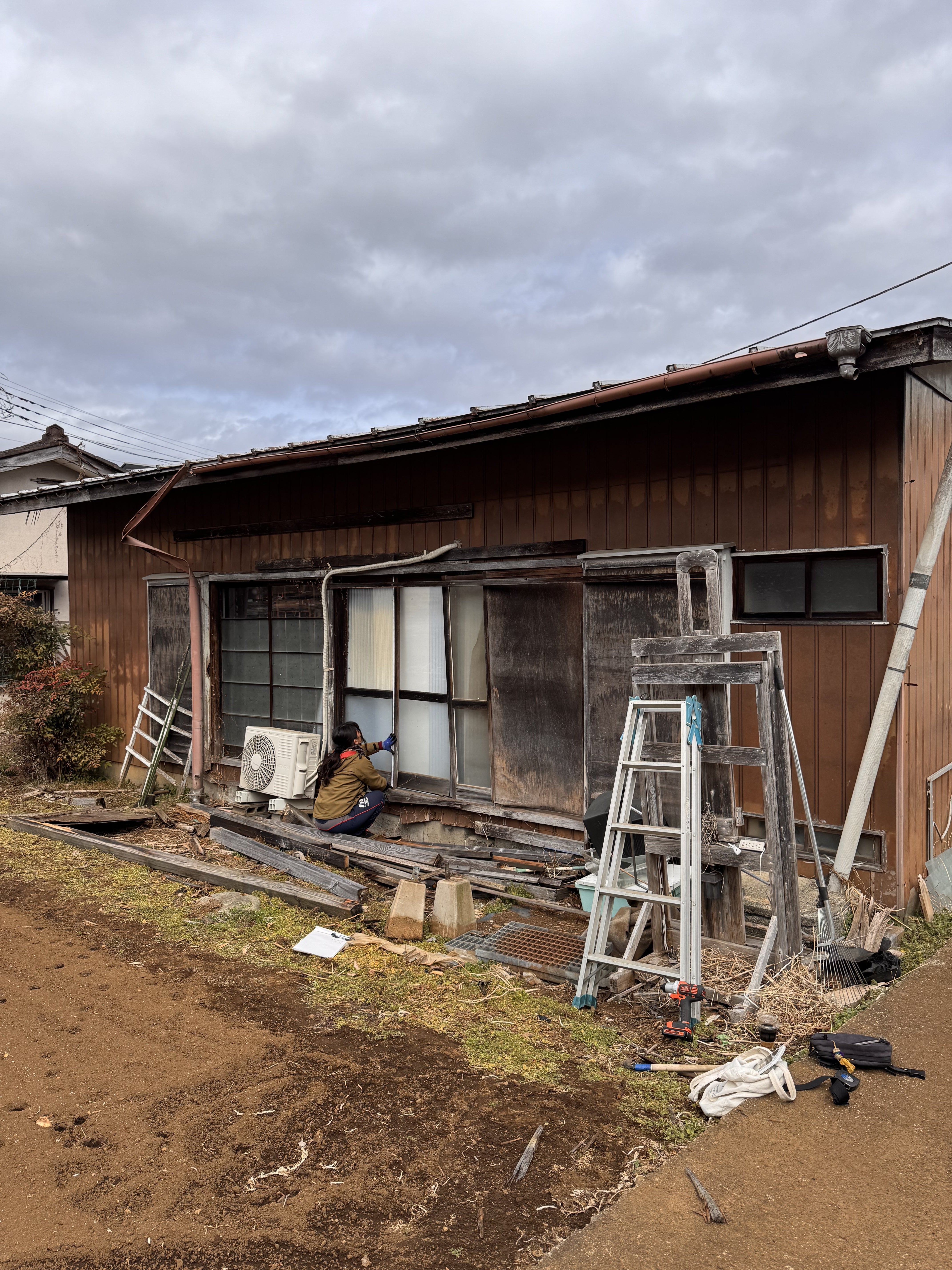 柱が抜け、すでに崩れかけているので窓の修繕と並行し、玄関の入り口ポーチを修繕し、ボコボコになった地面を修復します!今はそのために、まずはここの資材を移動させ、作業ができる小屋を作っている段階です。