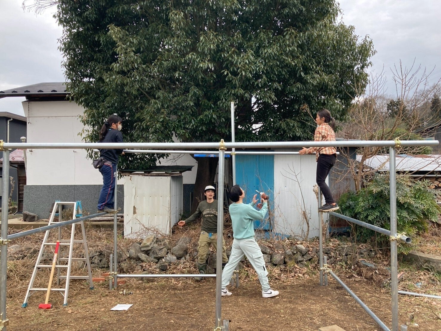 2025/03/23 19:56本日最終日です。無事目標を達成してホッとしています。そして、小屋作りの経過をご報告します!今月11日ごろから小屋づくりを始めたものの、遊びに行ったり、罠や解体を教わったり、竹を切りに行ったり、設楽さんがきてくれたり、杉山商店の初出店など、PCJの畑を手伝ったりなど、報告をあげる時間がなかなか取れませんでした。すこし時間差ですが、簡単に。まず、今回は木工作業ができるような2.8m x3.5m(6畳位)の簡易小屋を作ります。小屋を建てる場所は、もととも畑だったところにものを作ることにしました。地面への固定があるか、外との遮断性、面積、用途によって決まりが色々あります。束石(つかいし)を使って木材を乗っける予定でしたが、何かと調整がしやすく、集まった短い廃材を有効に使うためにも単管で組むことにしました。草刈りをすると左の奥が低いので、単管を打ち込む際に小屋が水平になるように水準器を当てながら調整します。1度ずれるだけで、3m先で何センチずれる、、など、結構シビアだなぁと。ただ、設計をしっかりしていれば、あとは組み合わねていくだけ。必要な本数を考えたり、組み替えたり、クランプを使って接続していき、骨組みの完成はこんな感じです。ここから、縦に気を貼り、以前から集めていた廃材を模様を考えながら貼りました。そして、前側は試しに竹でやってみよう!ということになり、近所の先輩の家に竹を頂きに行きました。急なお願いにも関わらず、とても丁寧に教えてくれて、なんだかとても嬉しかった。そして、時間と扱いやすさを重視して穴を開けて結束バンドで竹を固定。いまはこのような状態になっています。いろんな人が面倒を見てくれて、協議して、こうしようを考え、あるもので工夫してみる。物も人手も資金も、皆さんのおかげで成り立っています。おそらくクラファン終了前最後の報告です!皆さんのおかげで目標達成することができました。自分に何か出来るのか、何もできないのか、想いを伝えて誰が何を言ってくれるのか、自分のアクションが何に繋がるのか、いろんな人が協力してくれて、嬉しい気持ちになり、想いを伝えることの難しさを知り、お願いするのに疲れた時もありました。でも、やっぱり何かやってみるということは、僕はずっとやっていきたいなと思います。支援してくださった皆さんと、これからの未来を創っていきたいです。その第一歩!いろんな人の優しさに気がつくことができました。励ましてくれた方、意見をくださった方、感謝の気持ちでいっぱいです。絵本やその他の返礼品、体験リターン!お楽しみに!資金の使い道や返礼品の情報はその都度活動報告や公式ブログ等で発信いたします!更新こちらをフォロー↓杉山商店Instagramそれでは皆さん、また会った時にお話ししましょう。ありがとうございました。 もっと見る