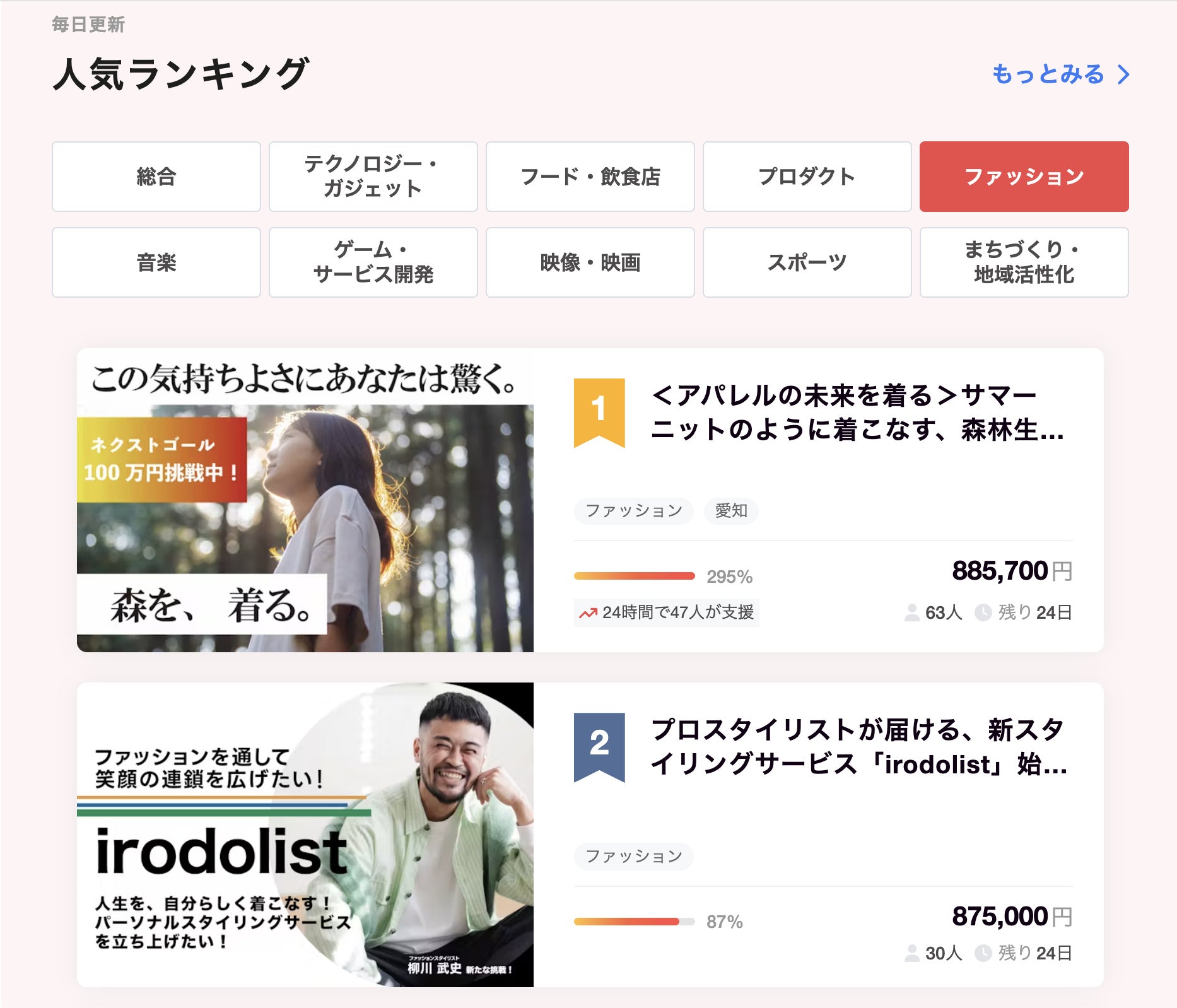 CAMPFIRE全体の人気ランキングで5位、ファッションのジャンルでは1位となっています。