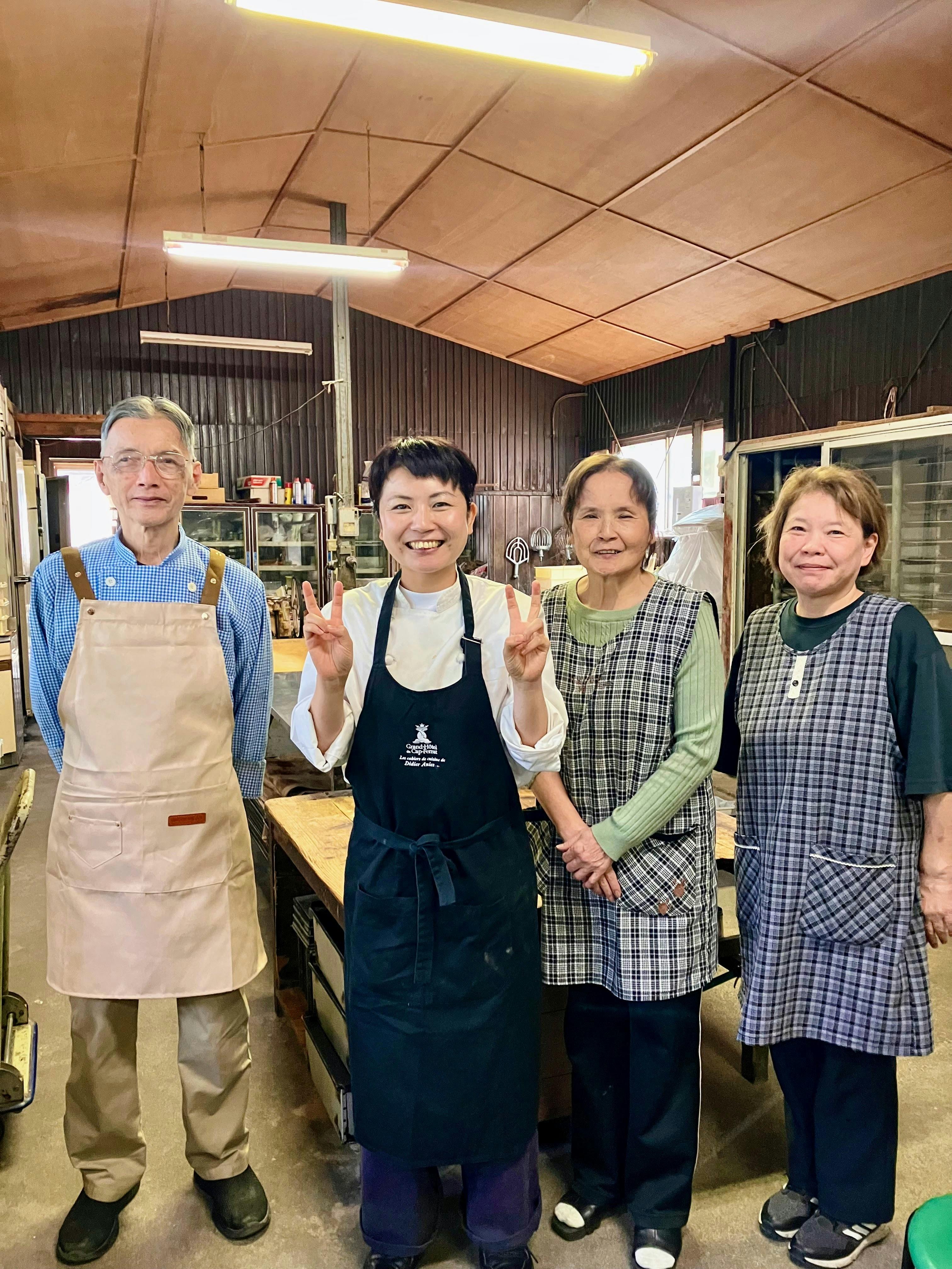 桂シェフの開発したフィナンシェを私たち栄進堂が確実に再現できるように、桂シェフに来島していただき、一緒に試作会を行いました。