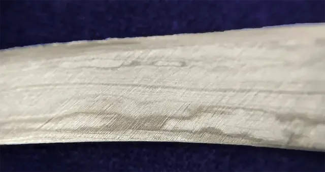 1. 玉鋼独特の特徴玉鋼は、刀鍛冶が折り返し鍛錬することで生じる、小さな線状のくぼみ、くすみ、黒ずみ、小さな亀裂や傷、鱗状の小さな剥がれが見られる場合があります。これらは素材の特性であり、品質上の問題ではありません。工芸品特有の、同じものは2つとない表情としてお楽しみください。