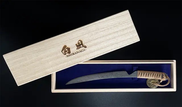 - 折り返し鍛錬によって誕生する鋼の層を“白凪”という波紋状に浮かび上がらせた名作。