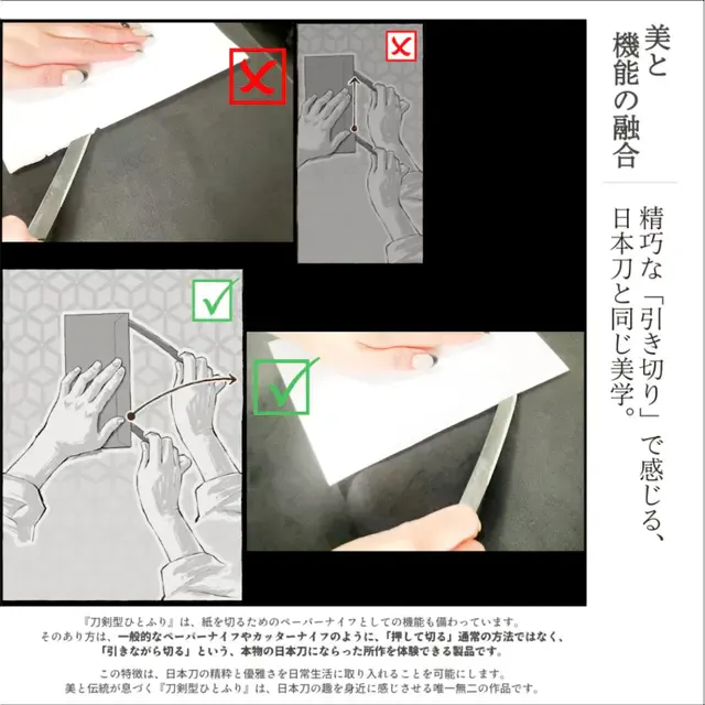 当社の刀剣型ひとふりは実用性と美しさを兼ね備えたサイズになっています。 全長は約20cm〜22cmで、扱いやすいサイズ感と重さとなっています。 これにより、書類を開封するだけでなく、デスクの一部としても美しく映える設計になっています。