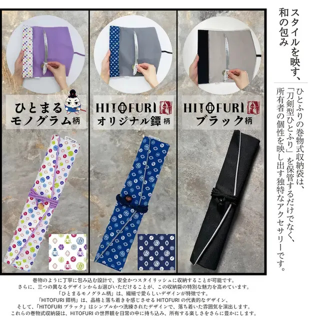 - 柄巻11色、巻物式収納袋3種から選べ、プレゼントにも最適。