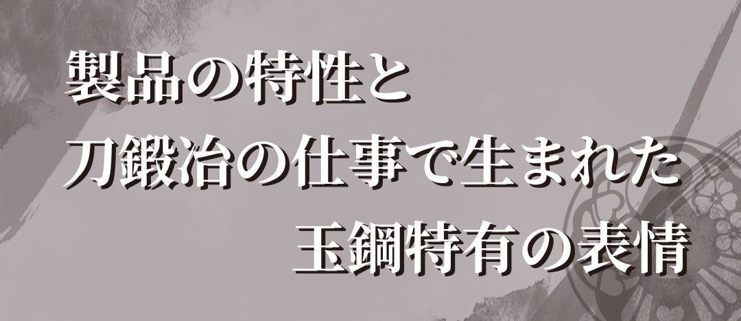 ※玉鋼の鍛錬による線状のくぼみ、くすみ、黒ずみ、小さな亀裂や傷、鱗状の剥がれは素材本来の特性ですので、これらは返品・交換対象にはなりません。