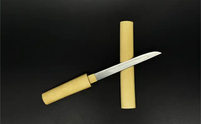 小刀は、刃渡りが13cm前後と小型ながら、一面に鑢(やすり)仕上げが施され、切り刃造りの技法で仕上げられており、日本刀としての本質を保ちつつ、現代のコレクションにも馴染むデザイン。