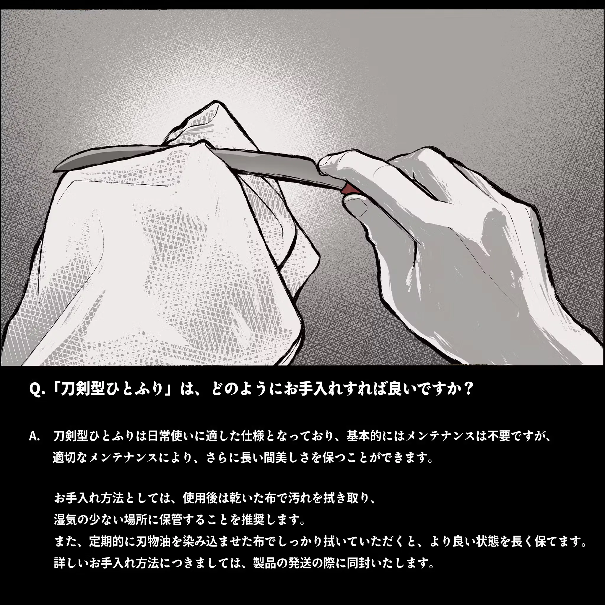 A.刀剣型ひとふりは日常使いに適した仕様となっており、基本的にはメンテナンスは不要ですが、適切なメンテナンスにより、さらに長い間美しさを保つことができます。