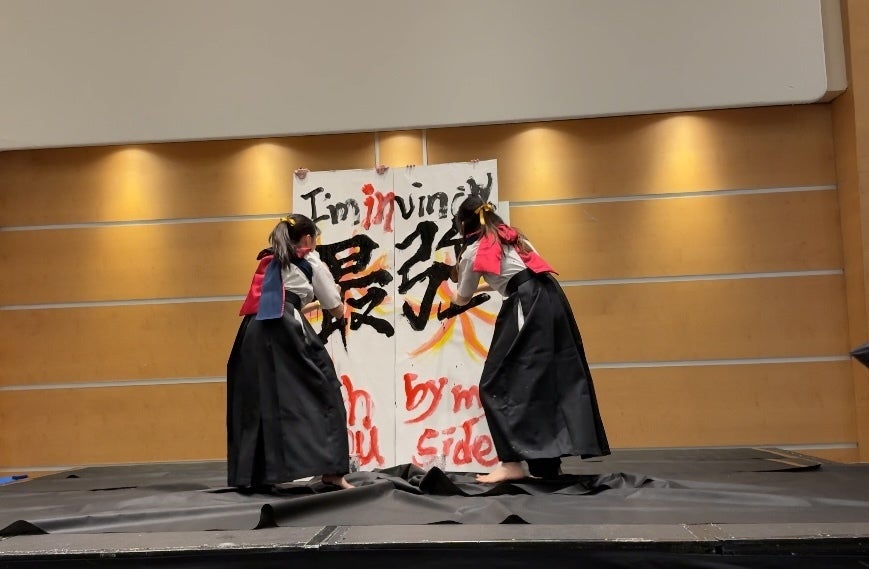 We belong to the Calligraphy Performance team, "Sazanami," at Waseda University in Japan.