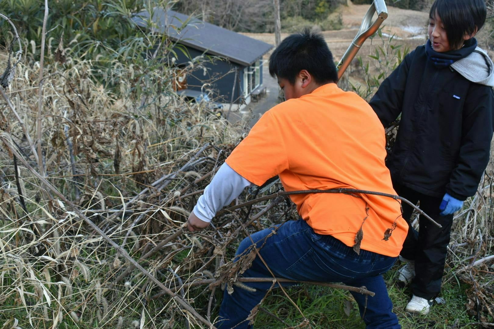 整地:兄弟や友人たちの力を借りて、栽培施設を設置するために整地を進めています。
