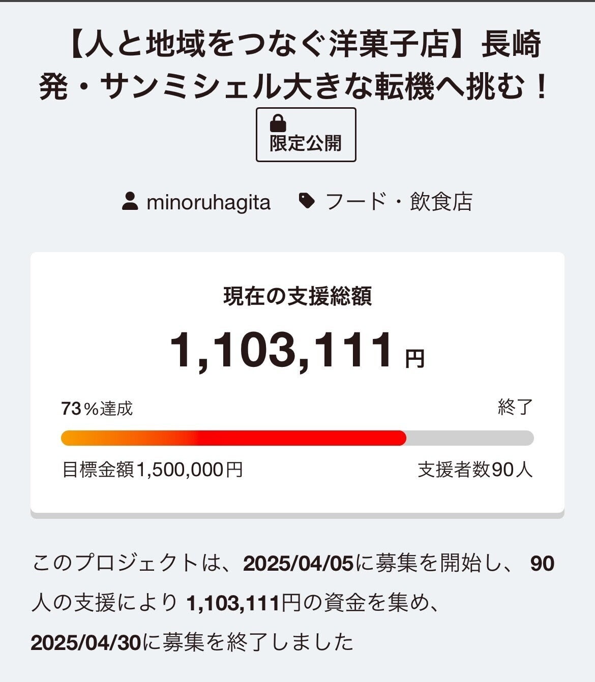 このプロジェクトは、2025/04/05に募集を開始し、 90人の支援により 1,103,111円の資金を集め、 2025/04/30に募集を終了しました
