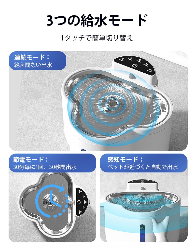 本製品は、ペットの飲水習慣や環境に合わせて選べる3つの給水モード(連続モード、節約モード、感知モード)を搭載しており、それぞれのモードが最適な飲水体験を提供してペットの健康をしっかりサポートします。
