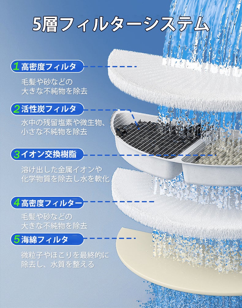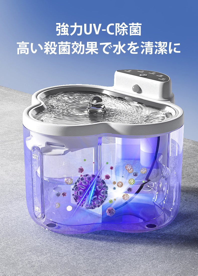 99.9%の細菌を除去するUV-C除菌機能と、毛髪や微粒子を徹底的に取り除く5層フィルターシステムにより、常に清潔で安全な水をペットが飲める環境を整えます。