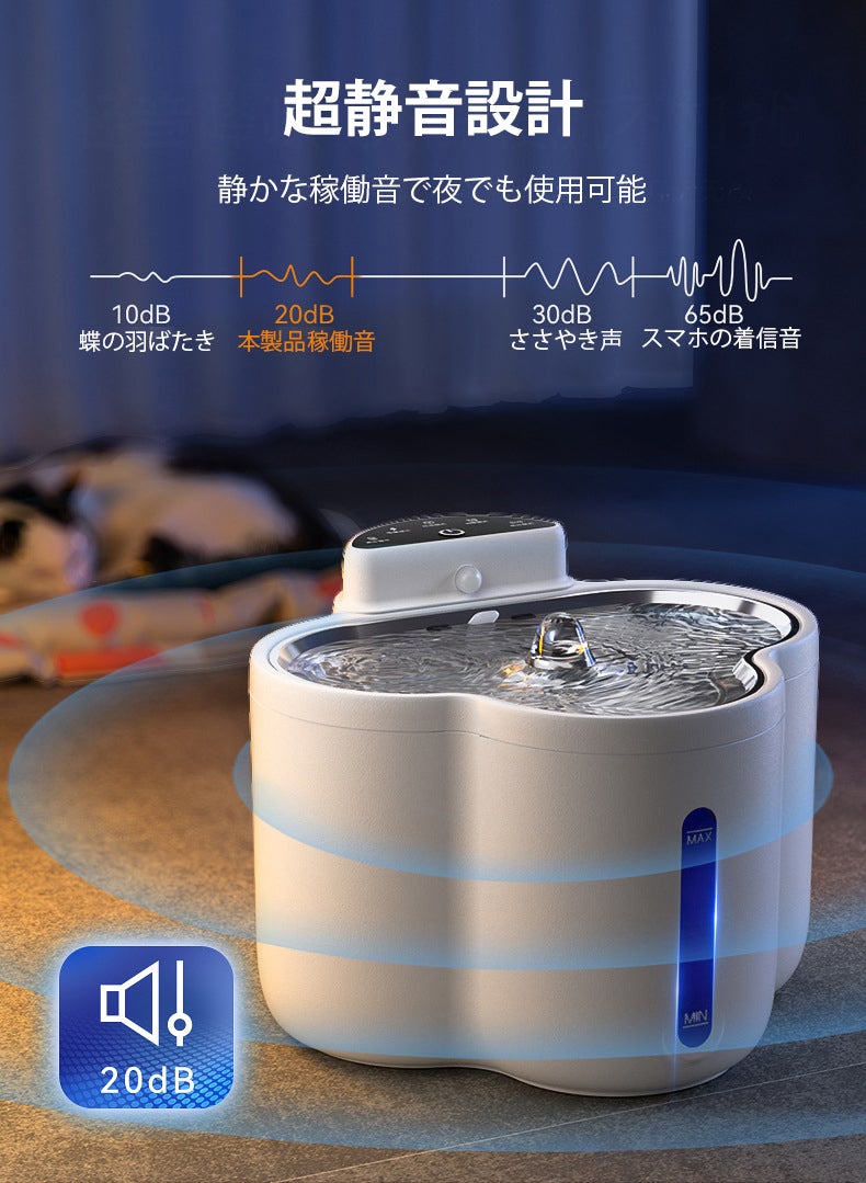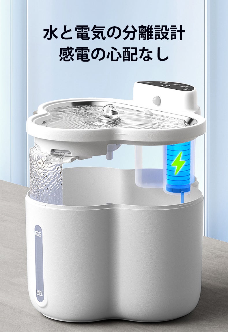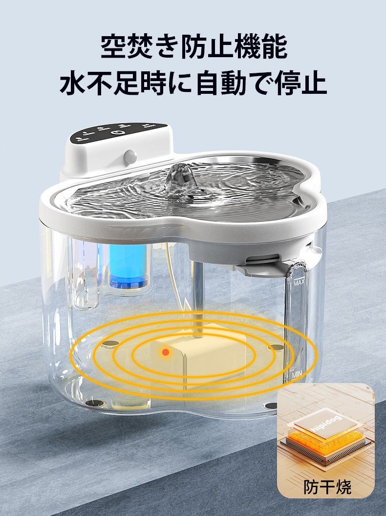 本製品は空焚き防止機能により、水不足時に自動で運転を停止することで、ペットの安全を守りつつ飼い主に安心と便利さを提供します。