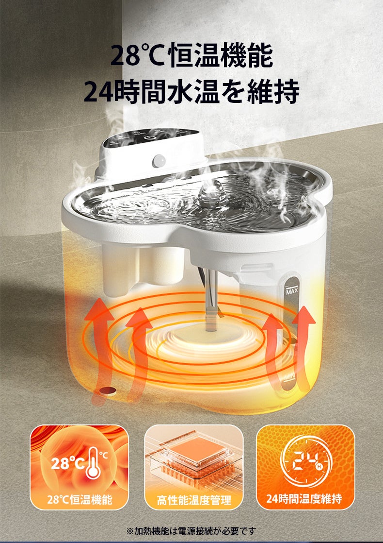 28℃に自動で温度を保つ恒温機能で24時間温かい水を維持し、寒い季節でもペットが快適に水を飲める環境を提供します。