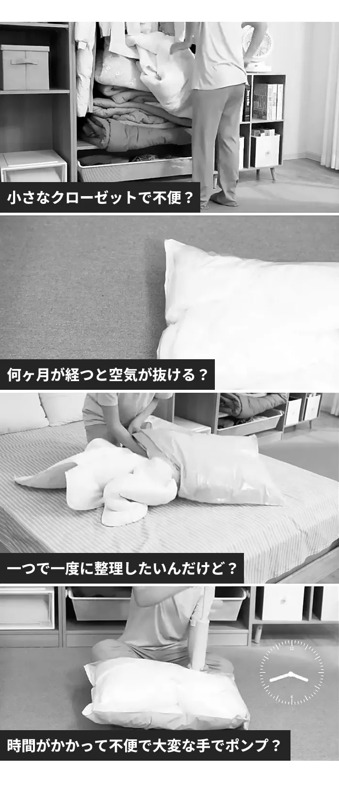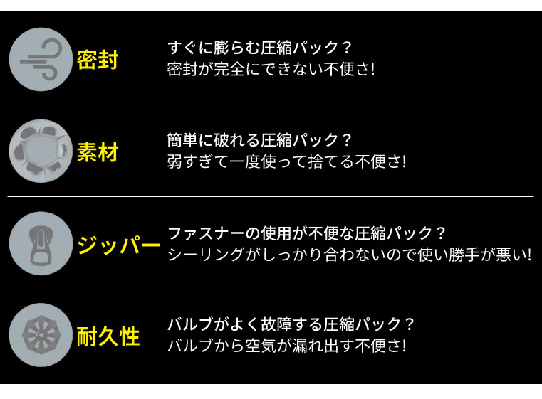 なぜ長く繰り返し使える圧縮パックを作らないのですか? このような購入者の不便さを知っているので、今までにない圧縮パックを作りました。