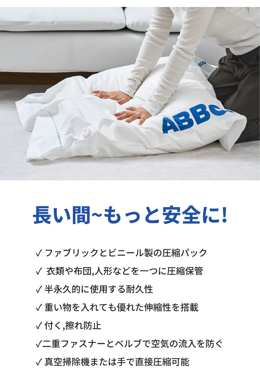 今まで考えていなかった新しい圧縮パックでファブリック素材とビニール材質で作って圧縮パックの上に物を載せても破損がありません。 鋭い物に触れても傷つかず、伸びることが少なく安心です。手や掃除機で簡単に空気を除去できます。