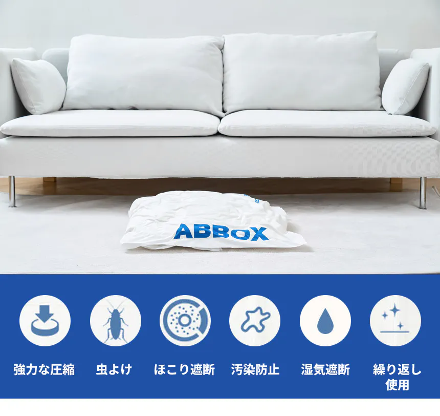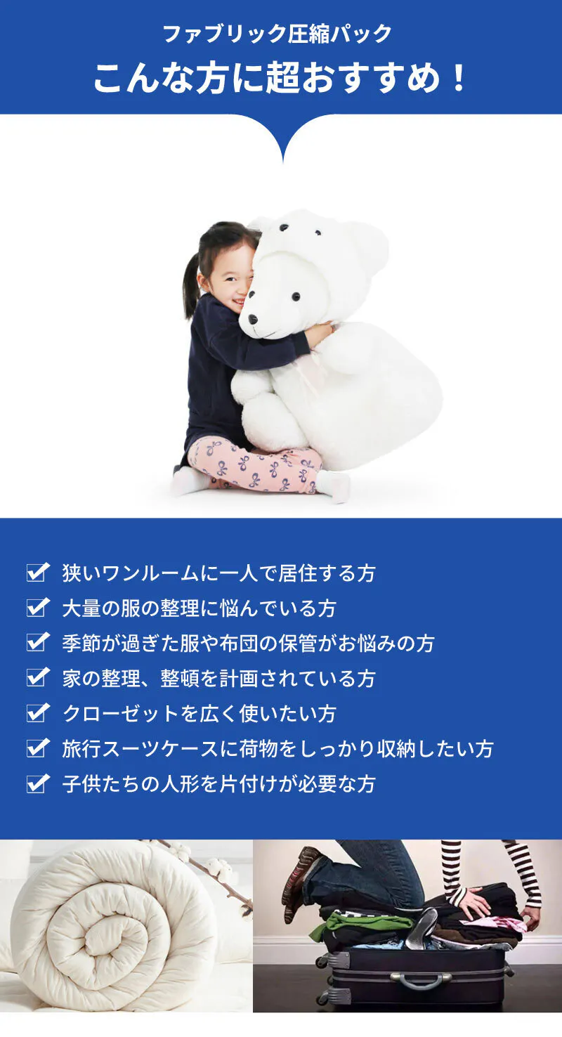 布団から衣類まで一度に整理できるファブリック圧縮パックは、ワンルームにお住まいの方は1枚だけでも布団、衣類を一度に整理することができます。