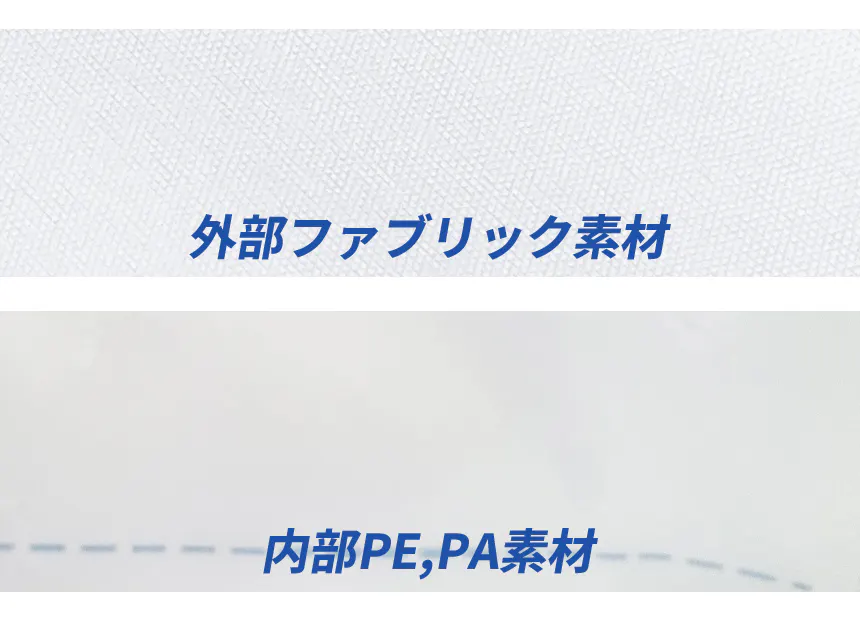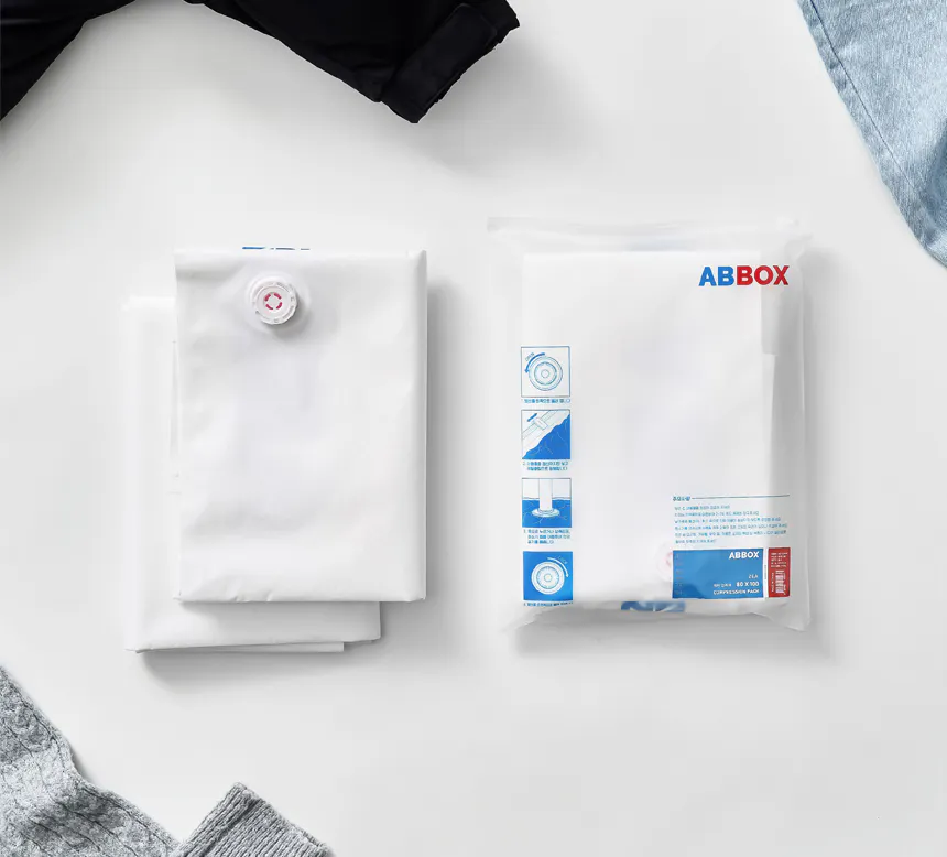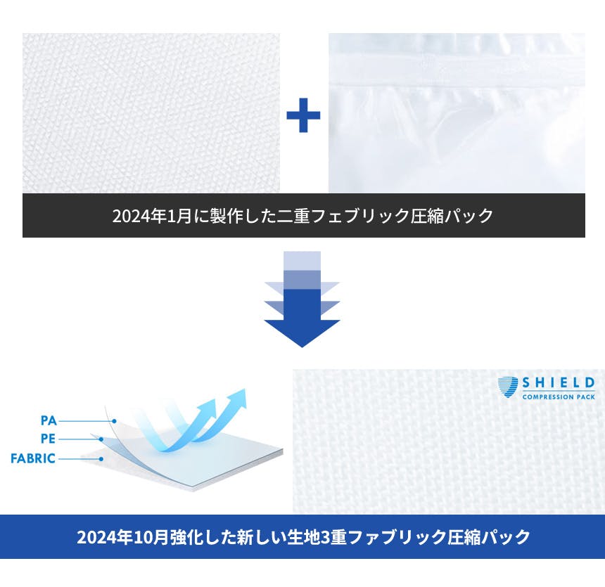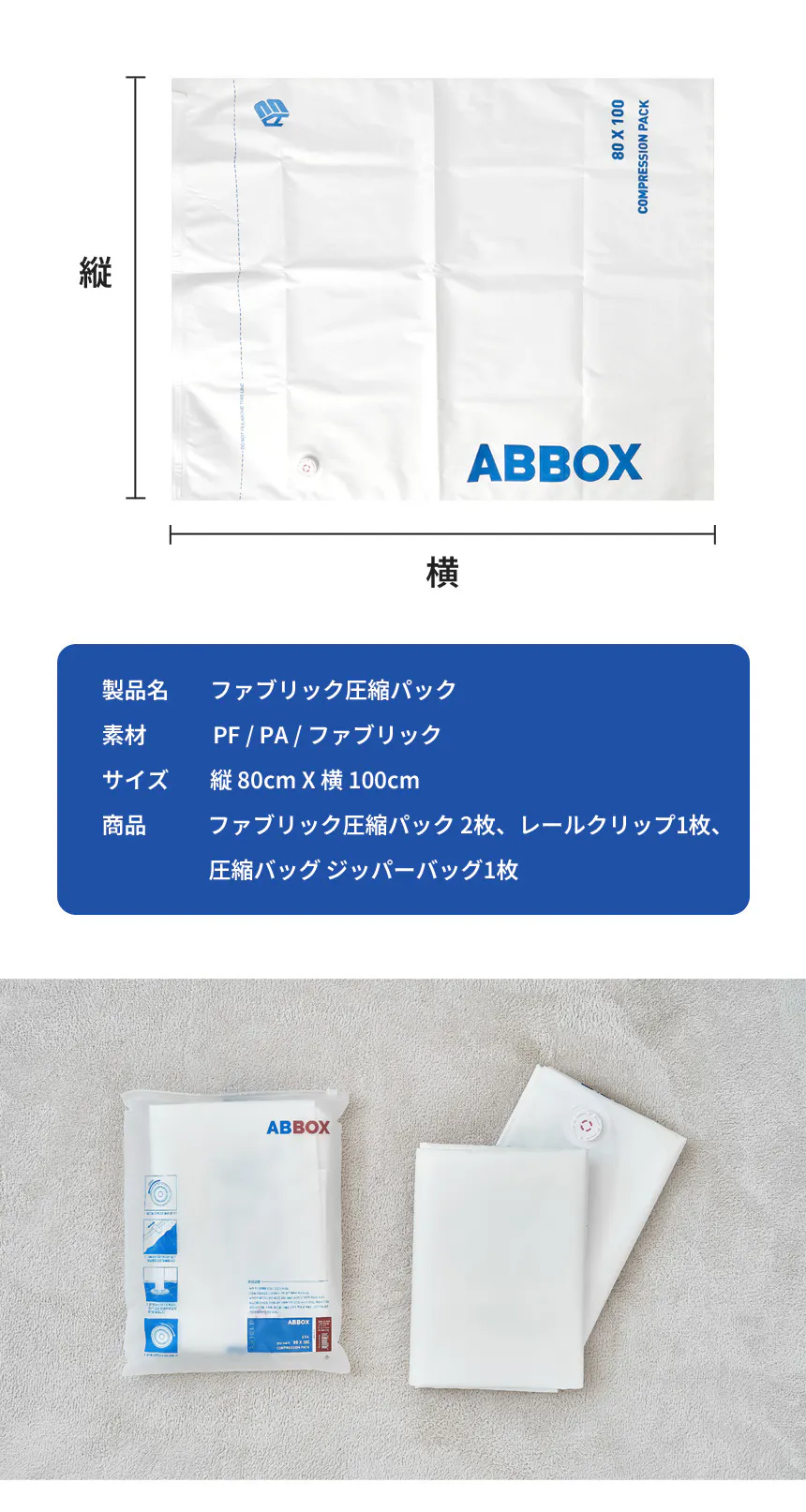 ファブリック圧縮パックは、今までの圧縮パックでは見られなかった新しい製造方法で、ファブリック素材とPA(赤ちゃんの哺乳瓶に使用する素材), PEを一枚に製作し、しわになりにくく強い圧縮持続力で長い間繰り返し使用できます。