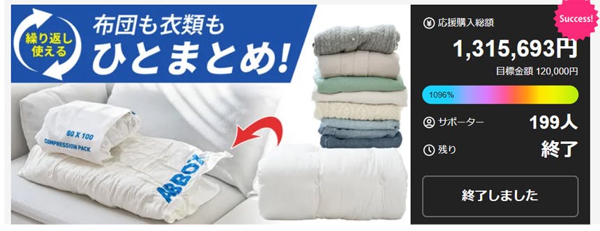 2025/02/04 15:24ご支援検討の皆様傷,しわにも繰り返し使用!ファブリックで強い耐久性と圧縮ですっきり!しっかり収納プロジェクトを公開しました。https://camp-fire.jp/projects/826115/view布団、衣類、ビニール圧縮パック、皆さん使った経験があると思います。さまざまなサイズで販売されていますが、品質はまちまちです。担当者も、これまで利便性で100円ショップで購入して使っていました。しかし、圧縮がうまくできたと思っていたのですが、数ヶ月経つと空気が流入したり、繰り返し使用をするためにはどこからか空気が流入したりしました。また、ビニールの素材は薄くて硬かったり、柔らかすぎたりして破損しやすいことがよくありました。それで開発された製品がファブリック防弾圧縮パックです。生地とビニールを1つに製作していて外部からの傷や、衝撃にも破損しにくく、内部はビニール素材で製作されているので弾力性を持っている防弾圧縮パックです。プレミアム防弾圧縮パックは、初期製作時に繰り返し使用することを第一のポイントとして製作され、繰り返し使用することができます。韓国先行クラウドファンディング販売後、不良率ゼロで多くの方々に絶賛されました。布団の整理、衣類の整理、プレミアム防弾圧縮パックで整理整頓してみてください。コメントもメッセージもぜひお気軽にお送りください。引き続き応援お願いします! もっと見る