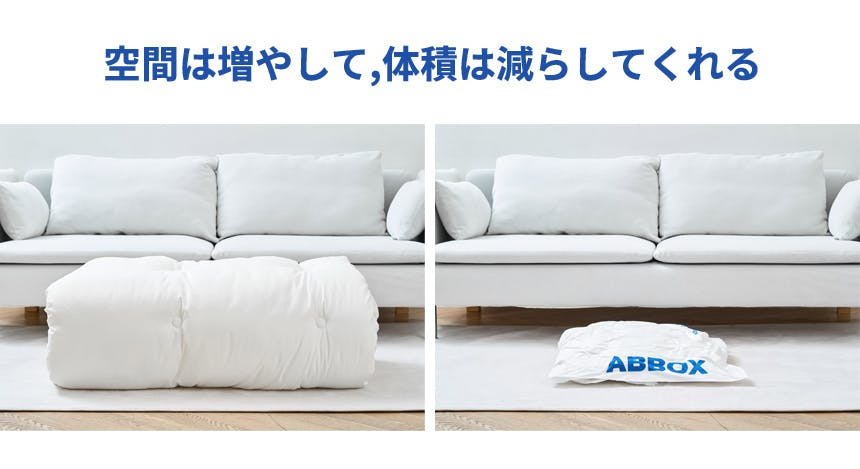 布団から衣類まで一度に整理できるファブリック圧縮パックは、ワンルームにお住まいの方は1枚だけでも布団、衣類を一度に整理することができます。