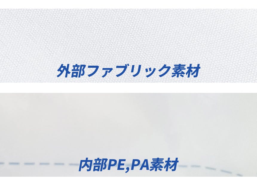 ファブリック圧縮パックは、今までの圧縮パックでは見られなかった新しい製造方法で、ファブリック素材とPA(赤ちゃんの哺乳瓶に使用する素材), PEを一枚に製作し、しわになりにくく強い圧縮持続力で長い間繰り返し使用できます。