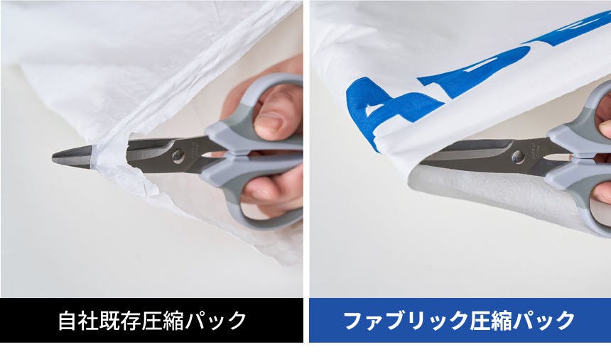 ファブリック圧縮パックはジップロック包装がされており、使用しない余分なファブリック圧縮パックを保管できるよう繰り返し使用できる包装紙を使用しています。