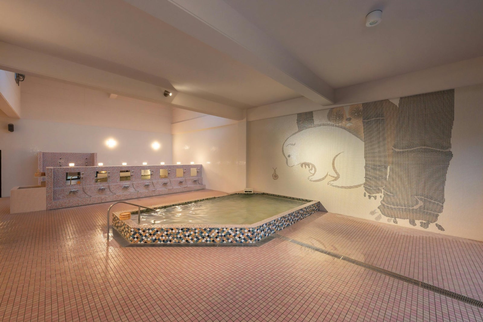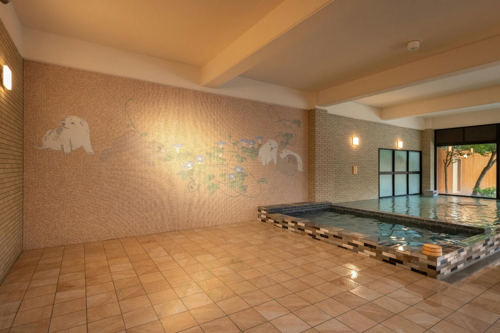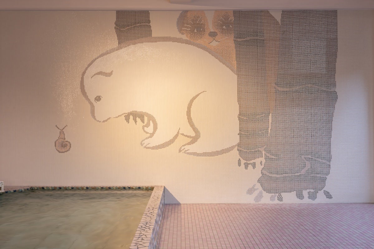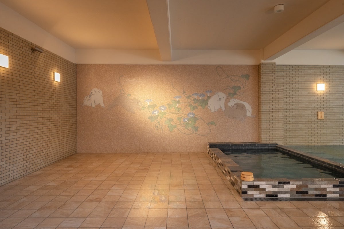 薪サウナと露天風呂は休業中ですが、土日祝日限定で内風呂はご利用可能です(2025年6月現在、大人 税込500円、小学生以下 税込300円でご入浴いただけます)。かわいいワンちゃんや色とりどりのタイルアートをご覧いただけます。