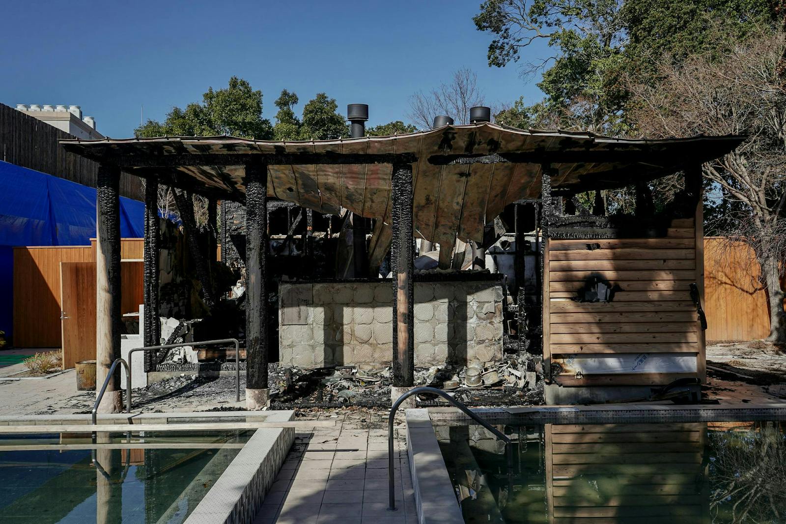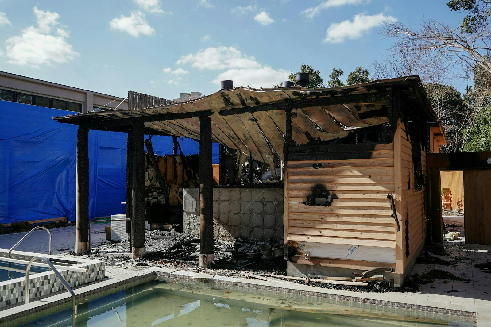 今回の火災によりサウナ棟2棟、サウナ棟内の薪ストーブ6基、露天風呂のタイルの一部、露天風呂を囲う塀、樹木、サウナ棟の周囲の電気設備、給排水設備等が焼失・破損してしまいました。