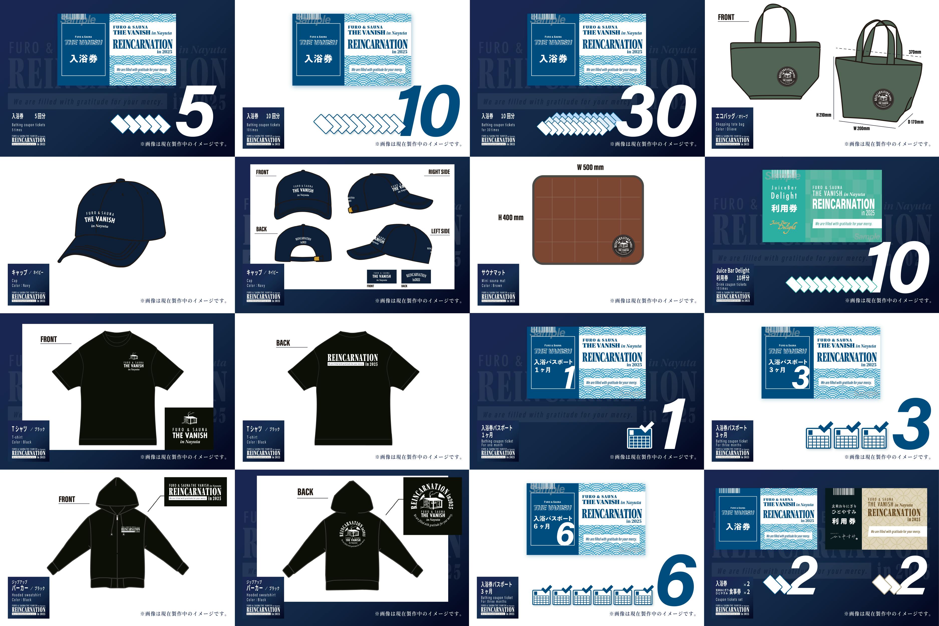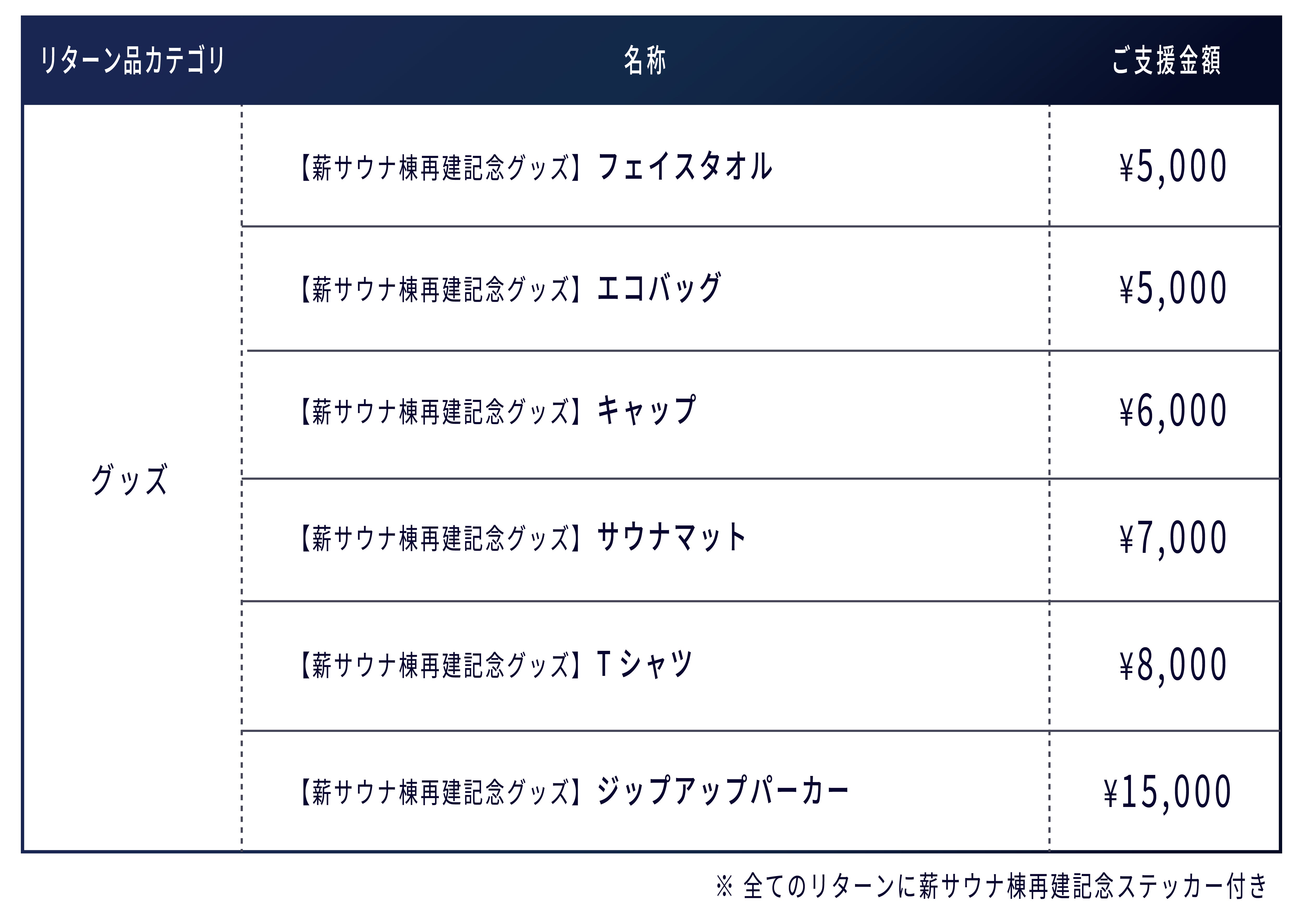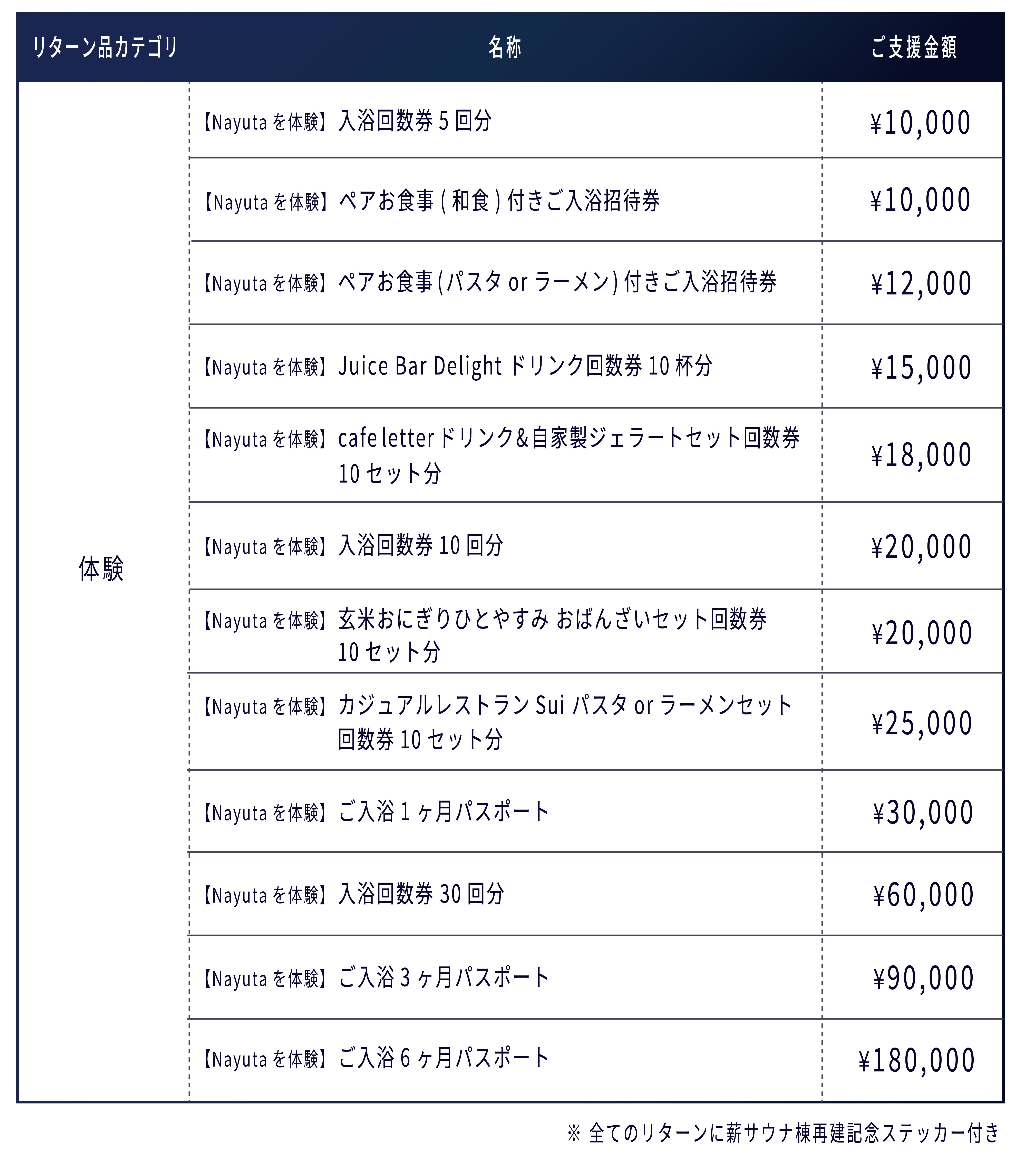 本プロジェクトのリターンには、サウナに関するものはもちろん、これまでお越しいただいたことがある方にも、これからお越しくださる方にも、Nayutaをお楽しみいただけるグッズや体験チケットをご用意しております。