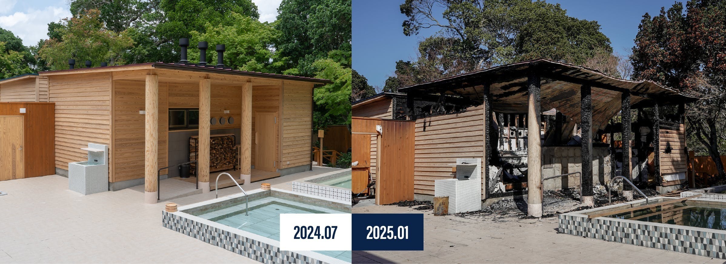 お客様にも親しんでいただき始めていた2024年末の最終営業日12月30日の営業終了後の深夜、お客様もスタッフも居ない時間帯に発生した火災(明確な原因は分かっておりません。詳細は後述)により2棟のサウナが焼失してしまいました。