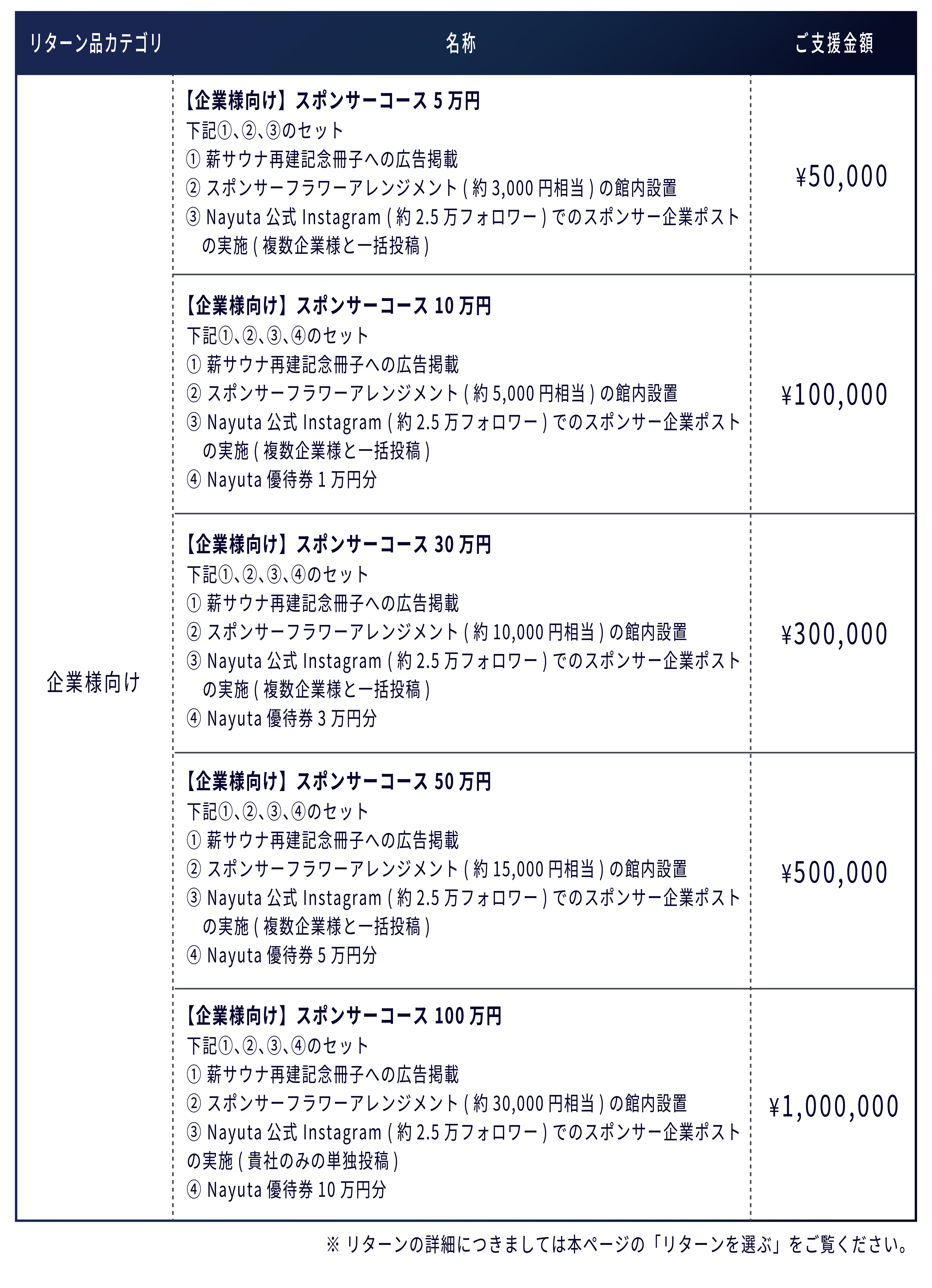 また、薪サウナ再建後の新しいNayutaを一緒に盛り上げてくださるスポンサー様も募集させていただいております。【企業様向け】のリターンをご覧ください。