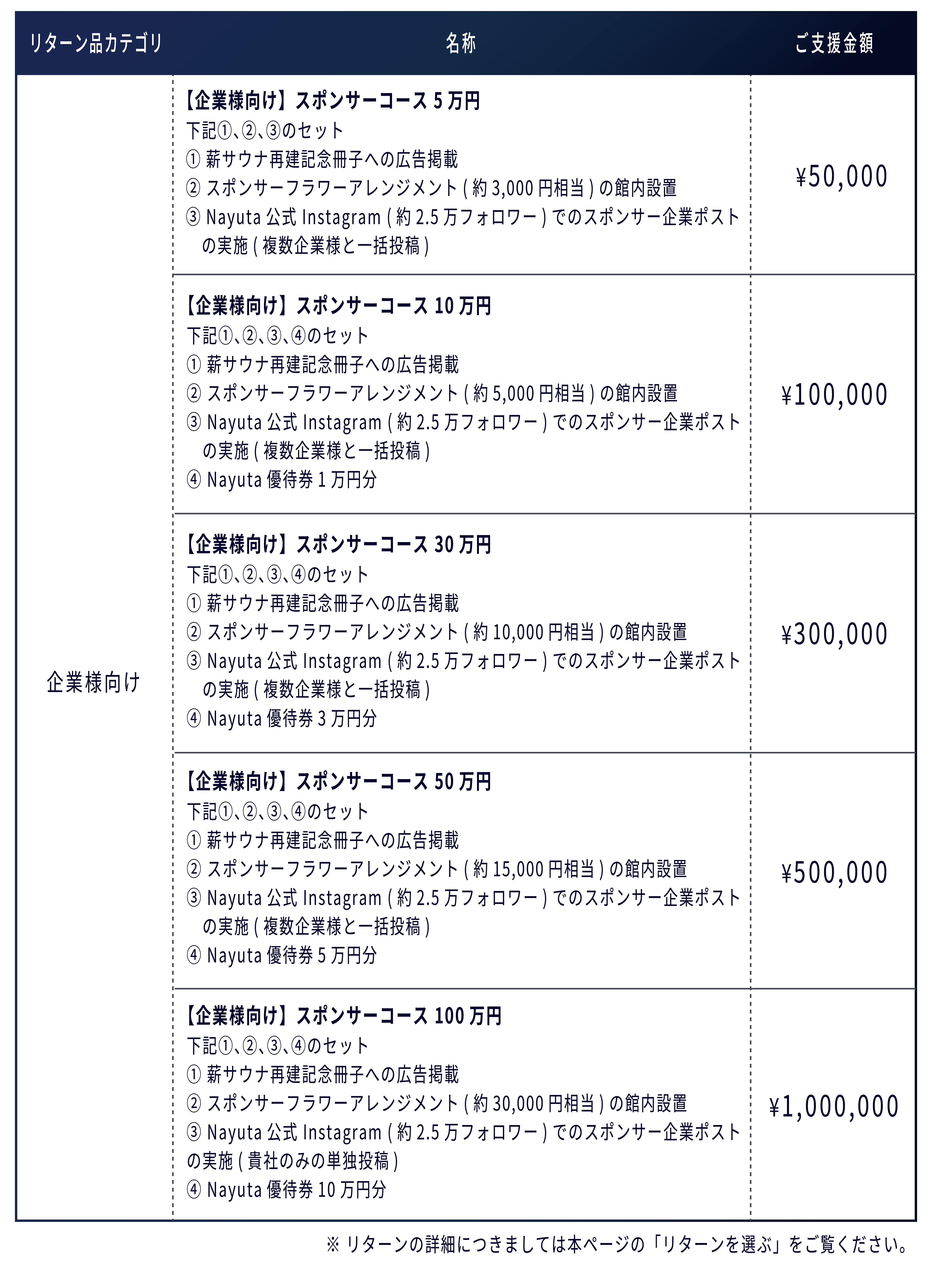 「企業様向け」リターン一覧