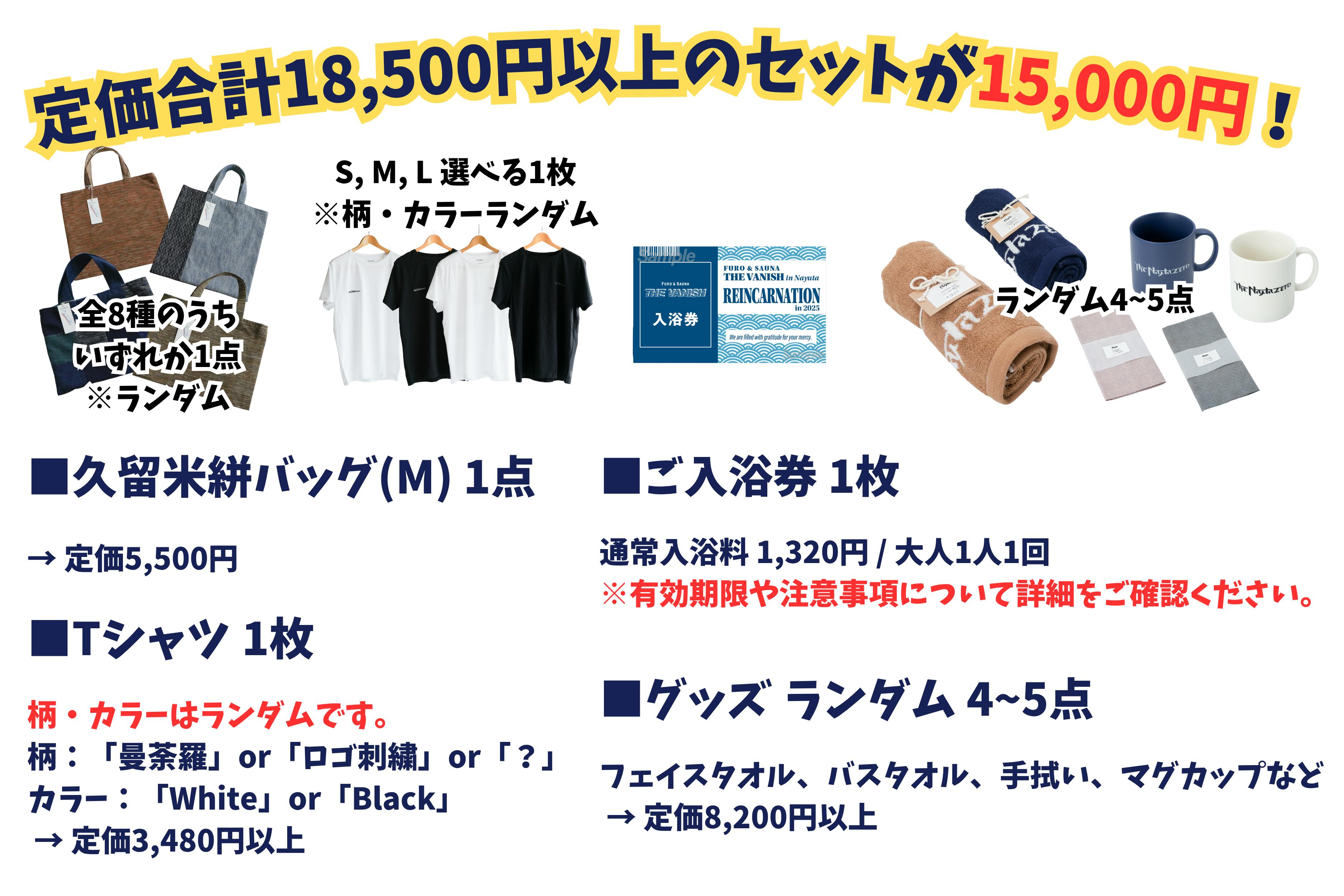 サイズが選べるTシャツ・久留米絣バッグ(M)入り!Nayutaグッズ詰め合わせ&ご入浴券セット