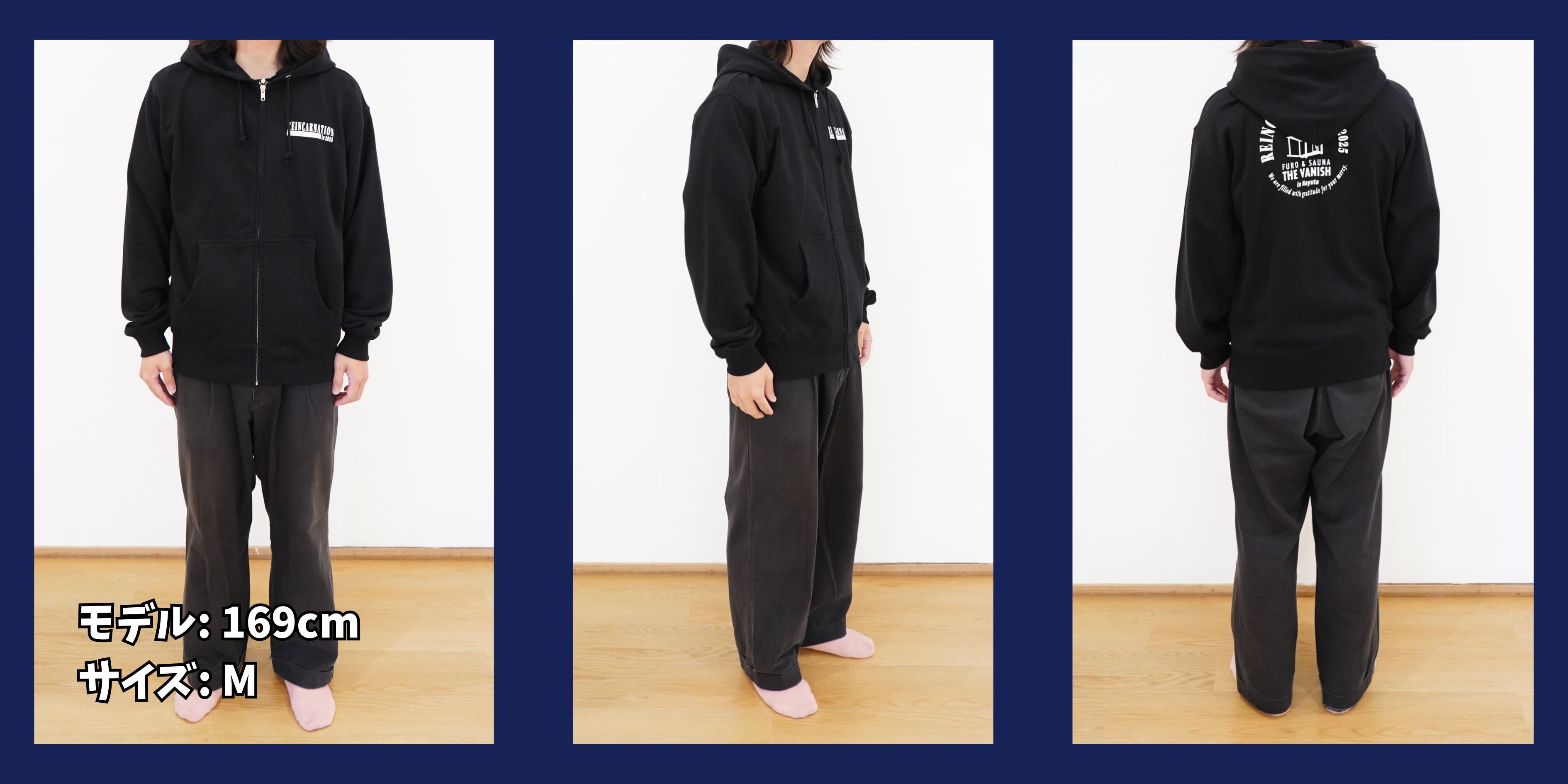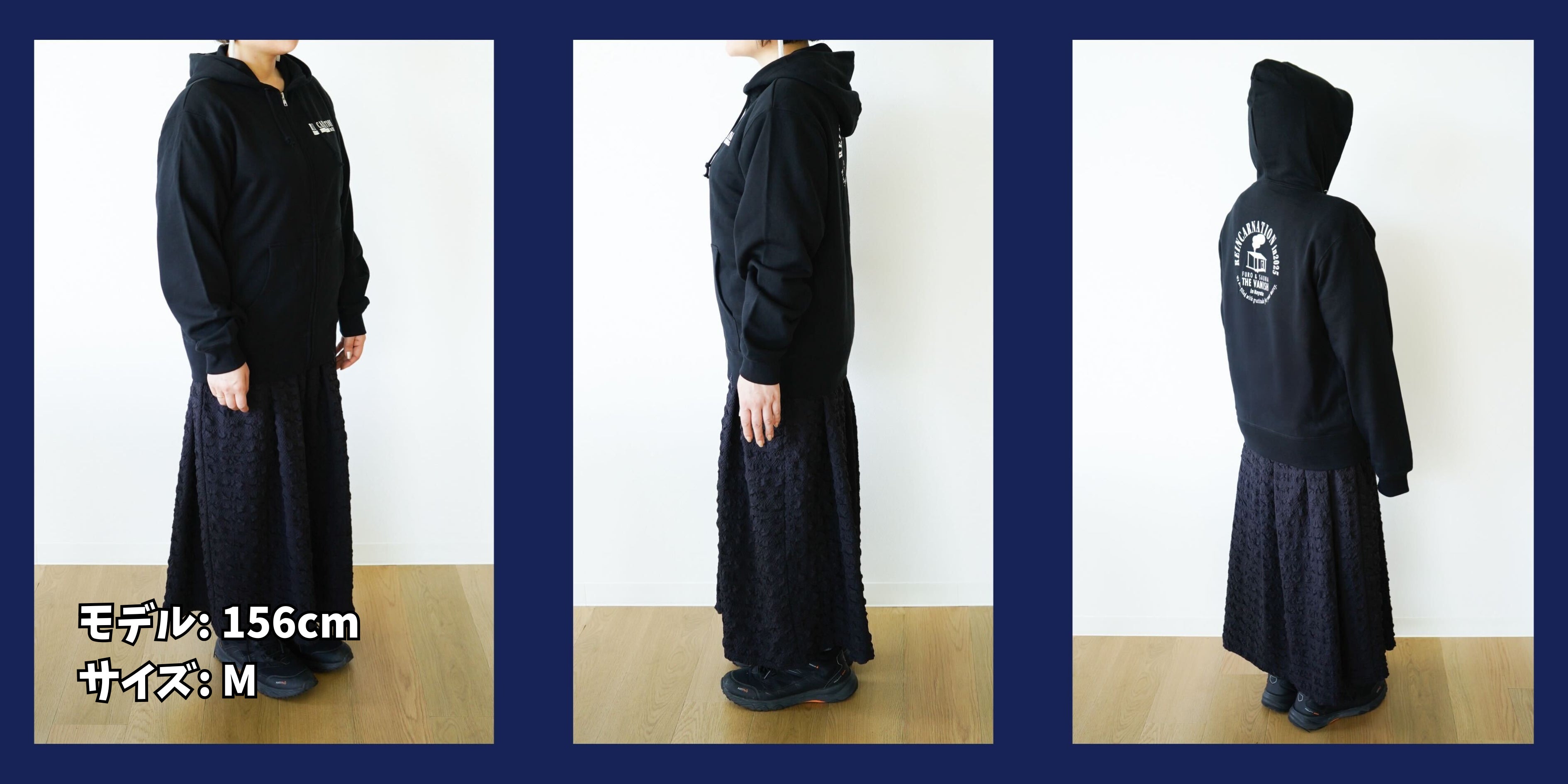 ジップアップパーカーは、背面の印刷を写真のサンプルよりも下部に配置し直し、文字の位置を調整してお届けいたします(フードで見えにくかったため)。
