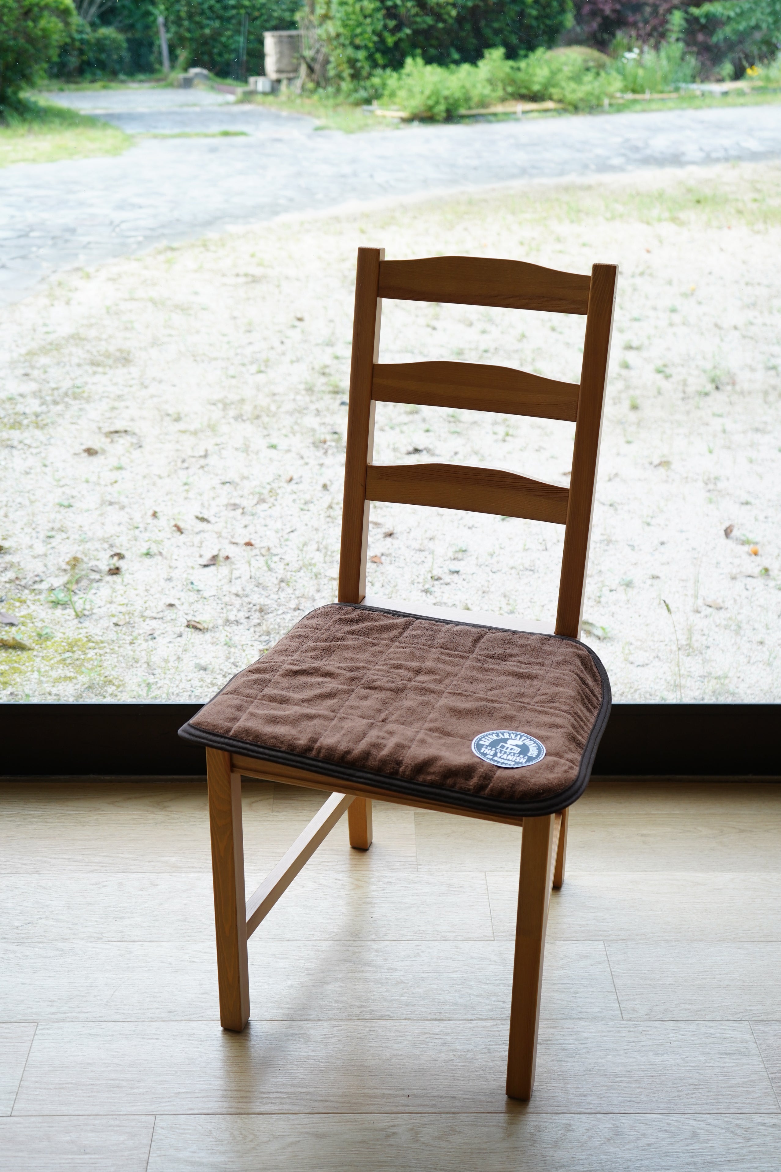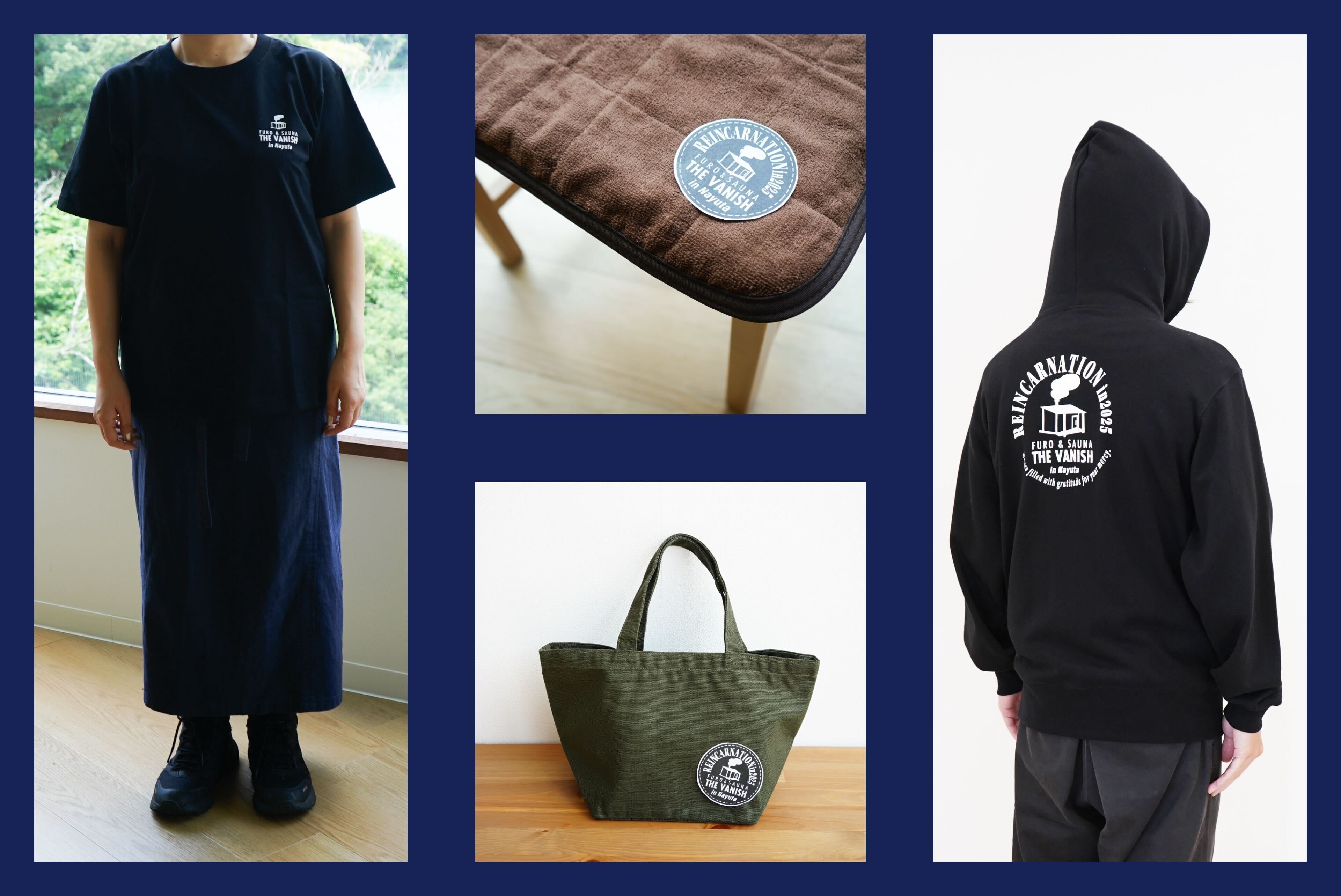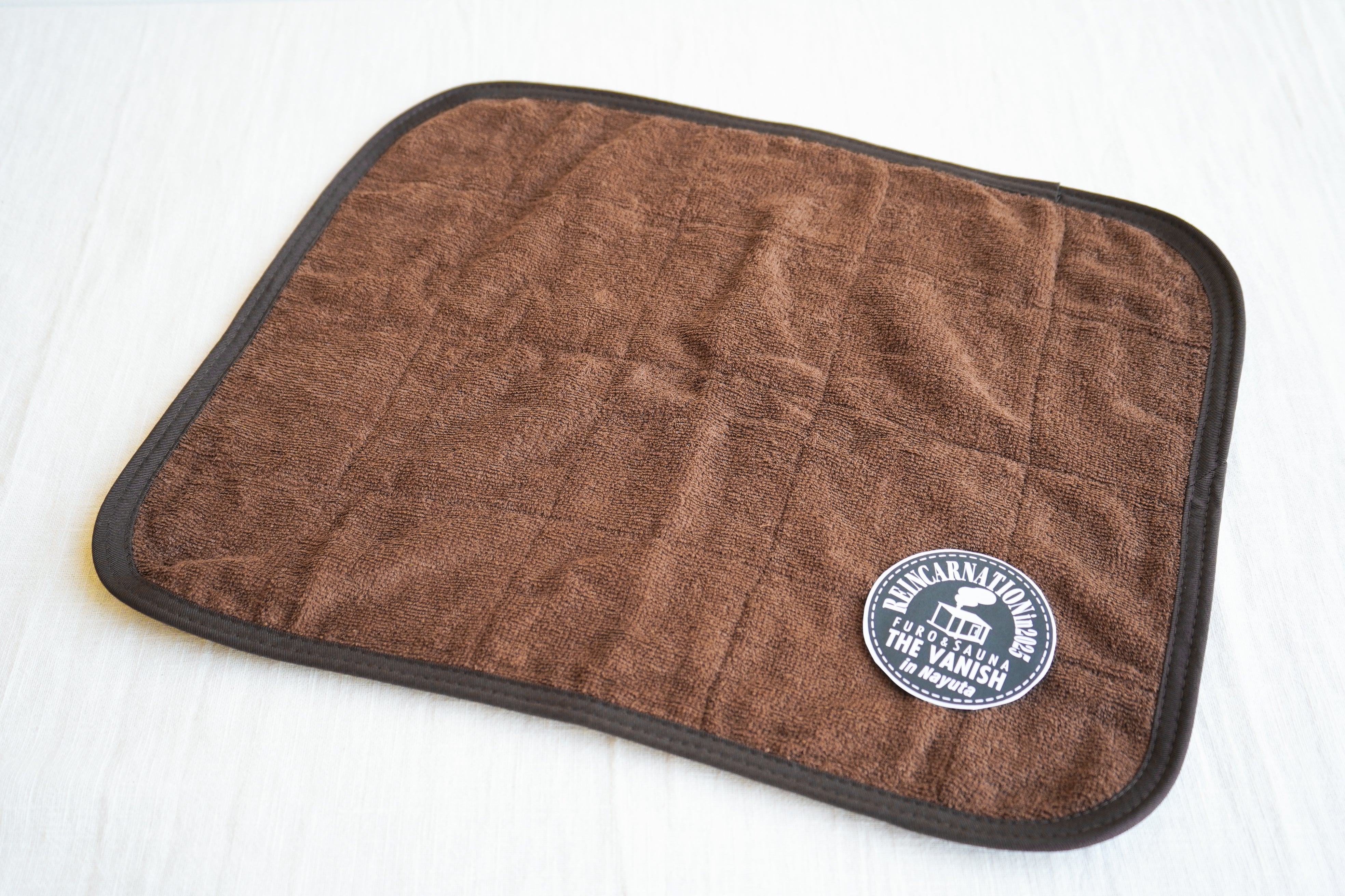 復活した薪サウナでぜひ使っていただきたい、"Reincarnation" のワッペン付きサウナマット。