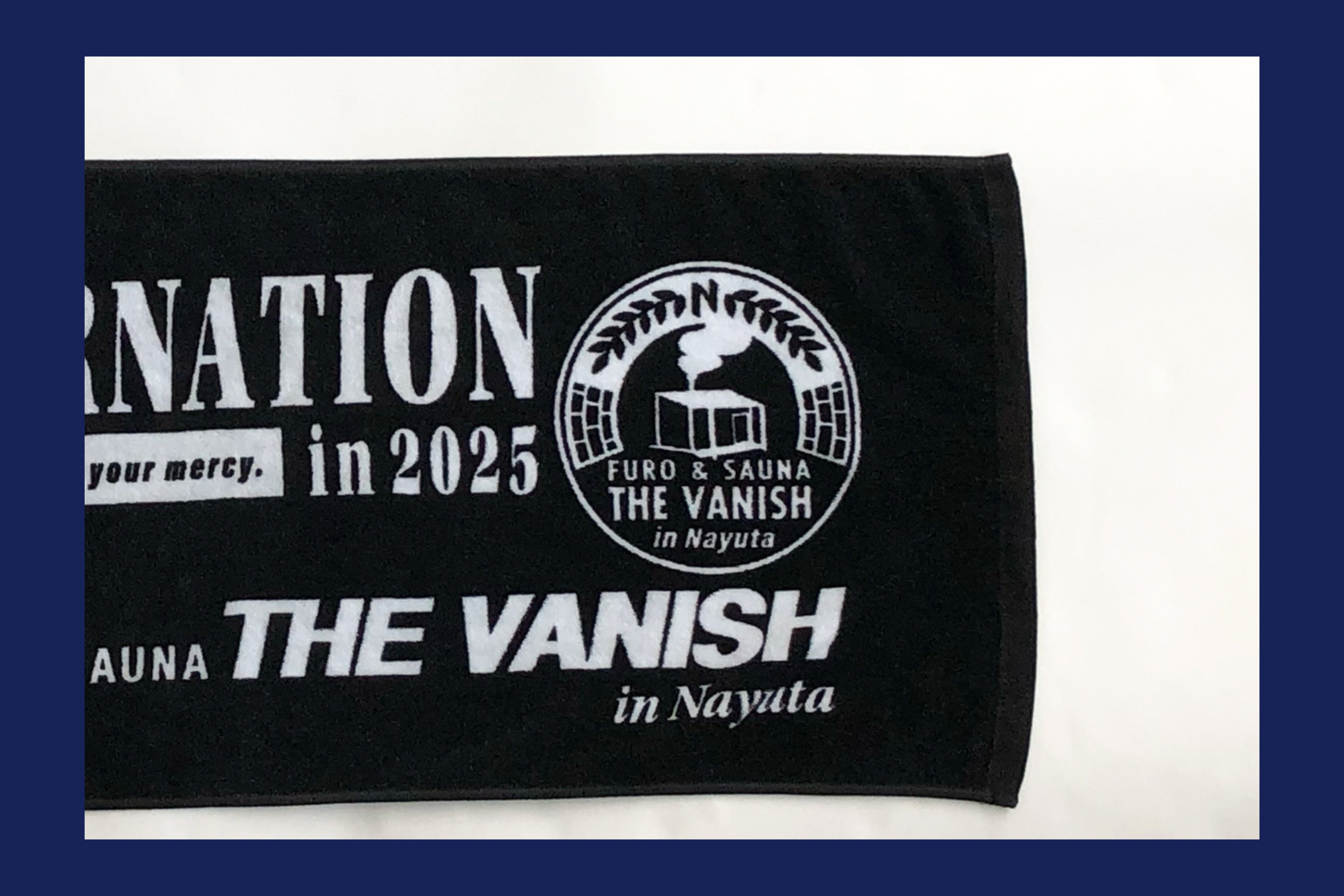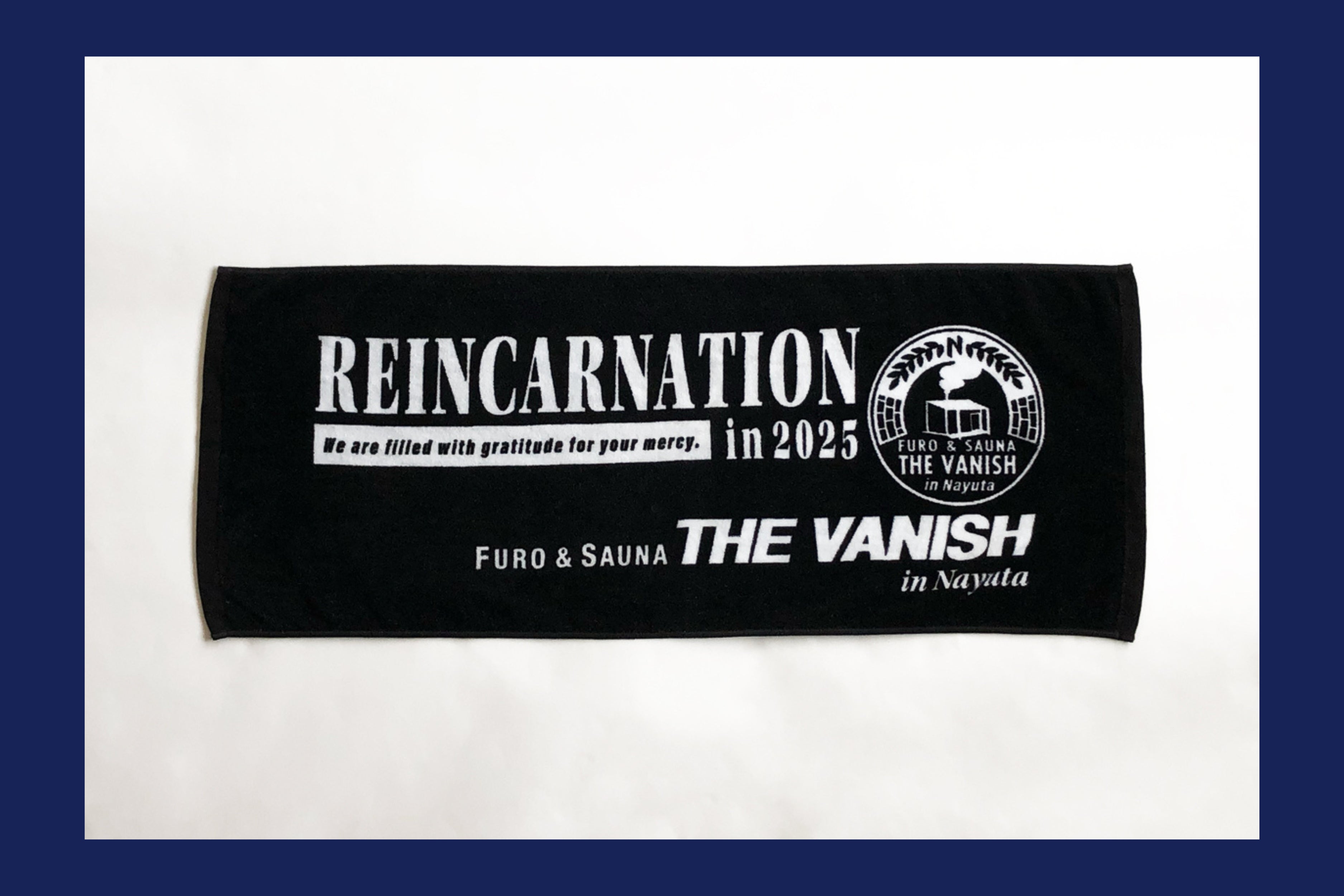 「生まれ変わり」を意味する「REINCARNATION」の文字を大きく配置した、薪サウナ棟再建記念グッズのフェイスタオル。