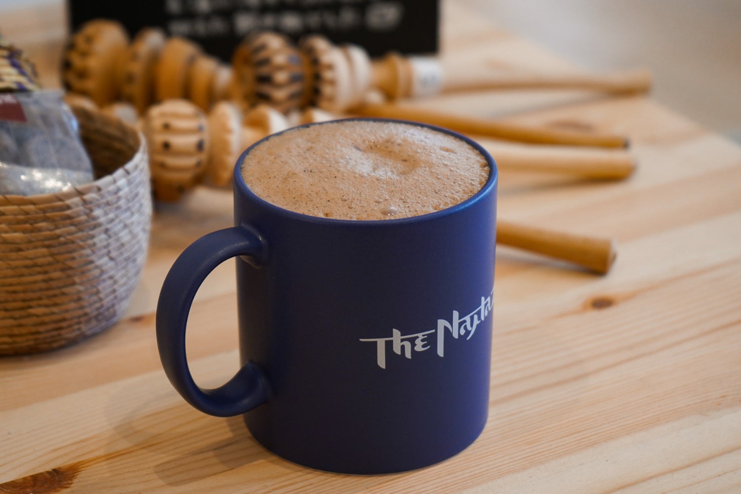 ぽってりとしたシルエットの、ロゴ入りマグカップ。