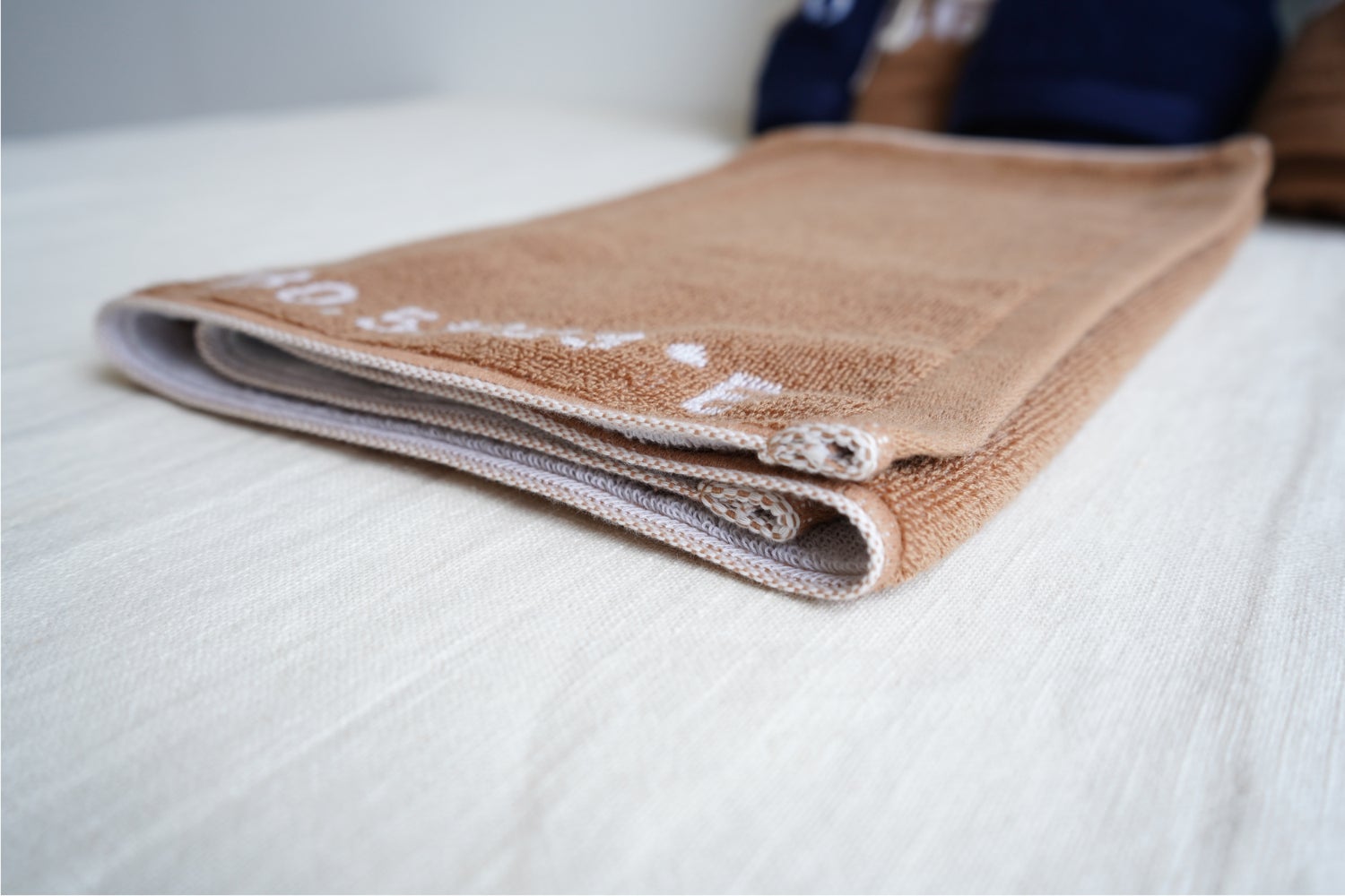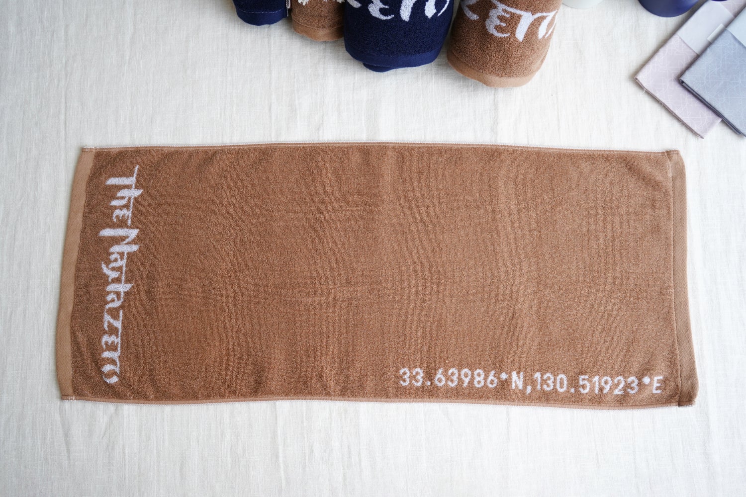 裏表反転した柄が特徴のジャガード織りで制作したタオルは、藍と茶の2色展開。