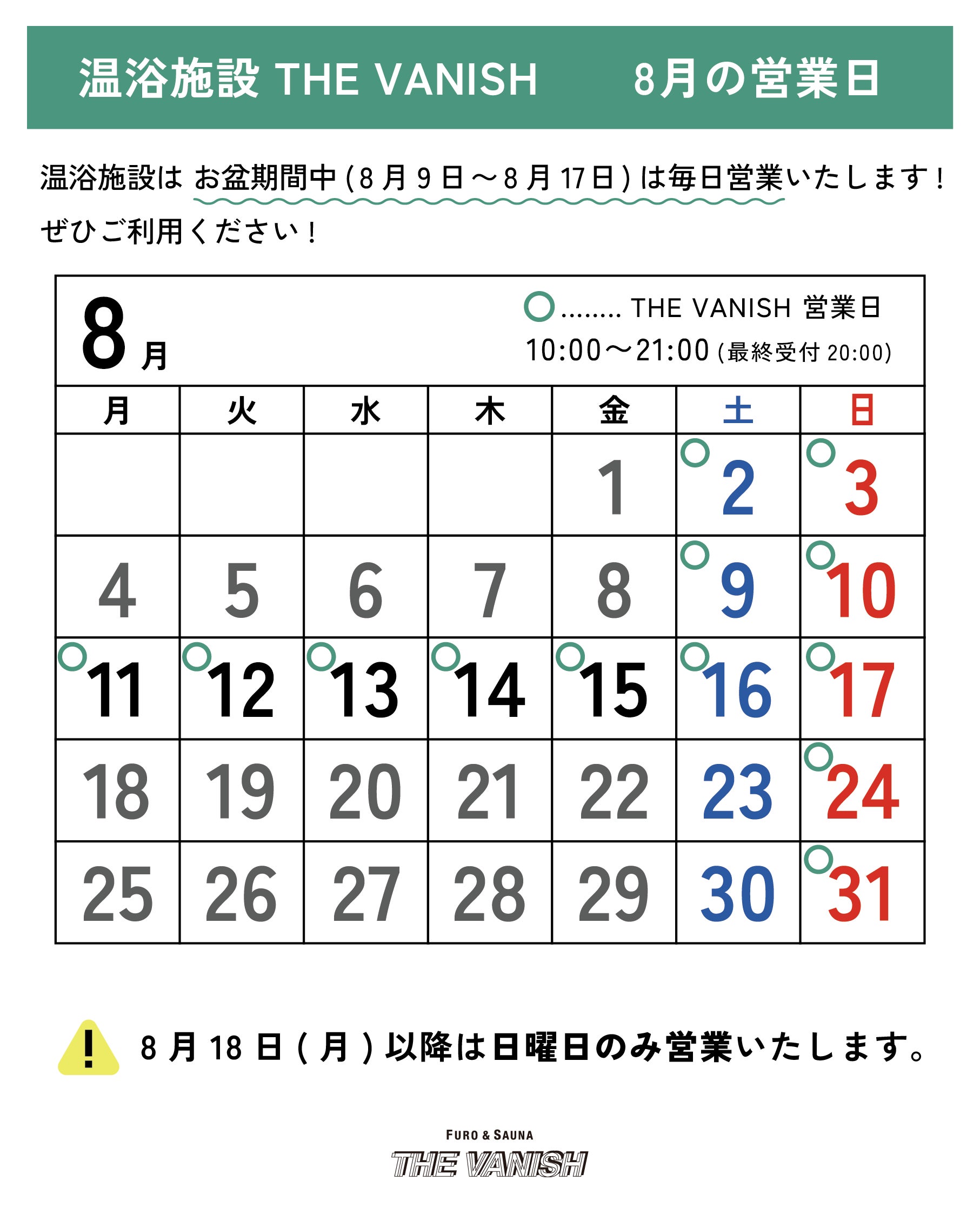それに伴い、THE VANISH はお盆期間 《8/9(土) ~ 8/17(日)》 の9日間の営業をもちまして