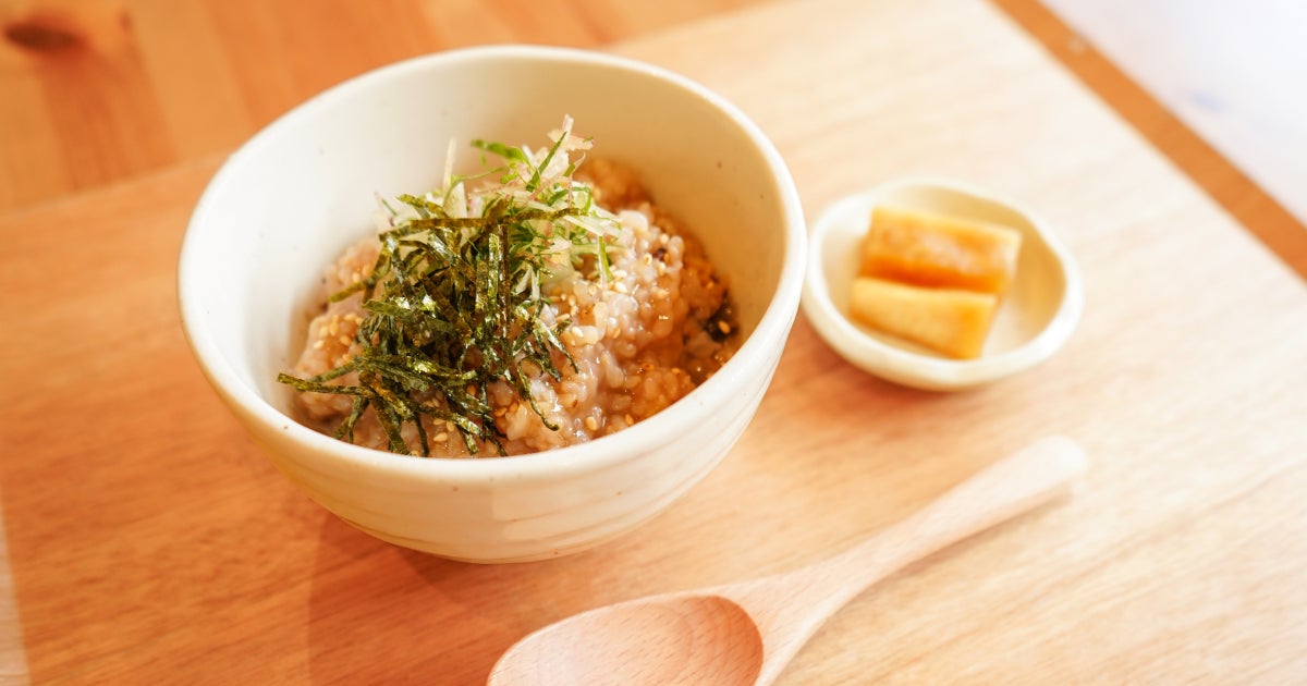 - 玄米・しいたけ・大葉・みょうが・生姜・ごま・海苔・醤油・粗塩・七味・自家製精進出汁汁