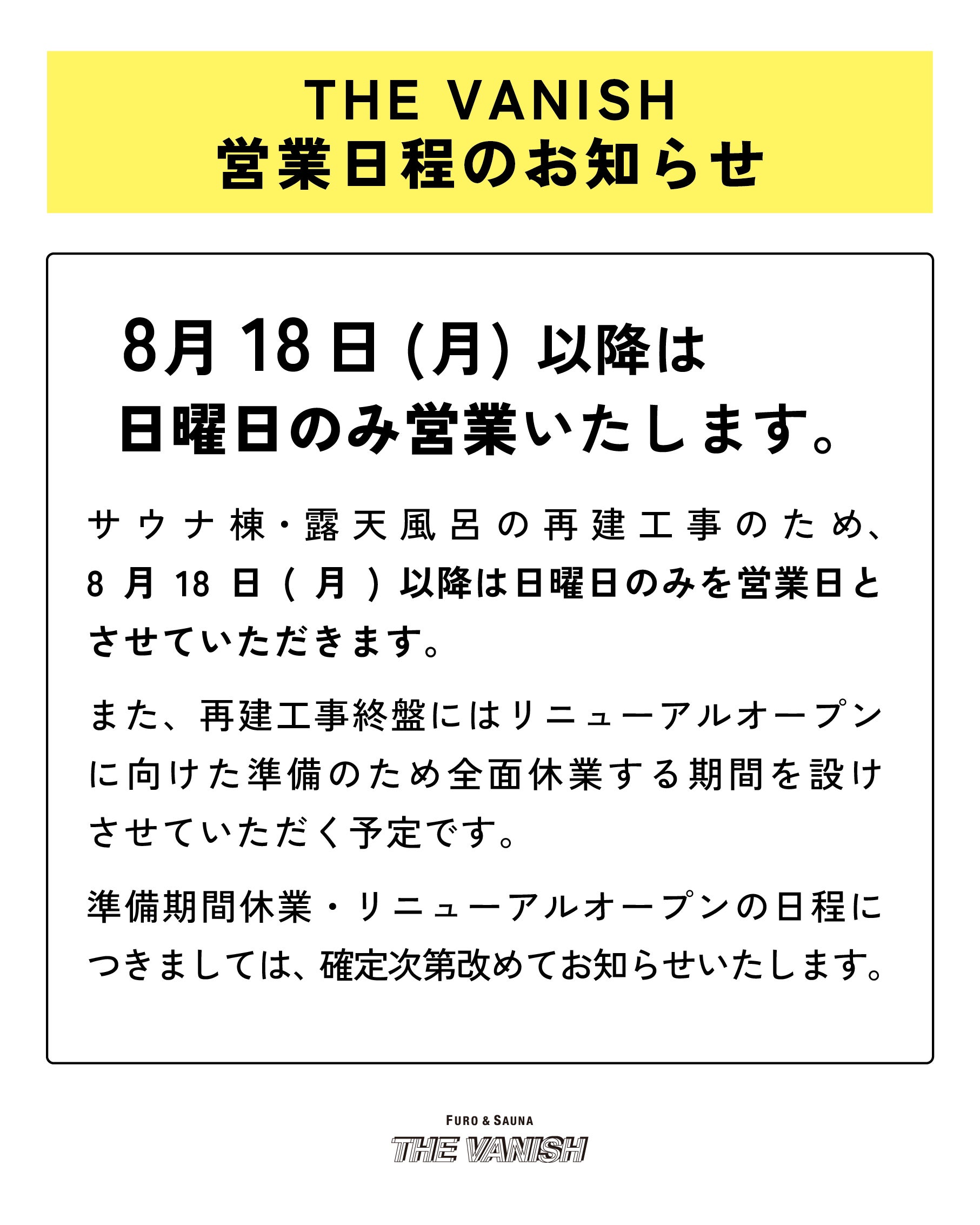 お盆明けの明日から、THE VANISH は薪サウナ棟の本格的な再建工事に入り、当面の間 日曜のみ の営業となります。