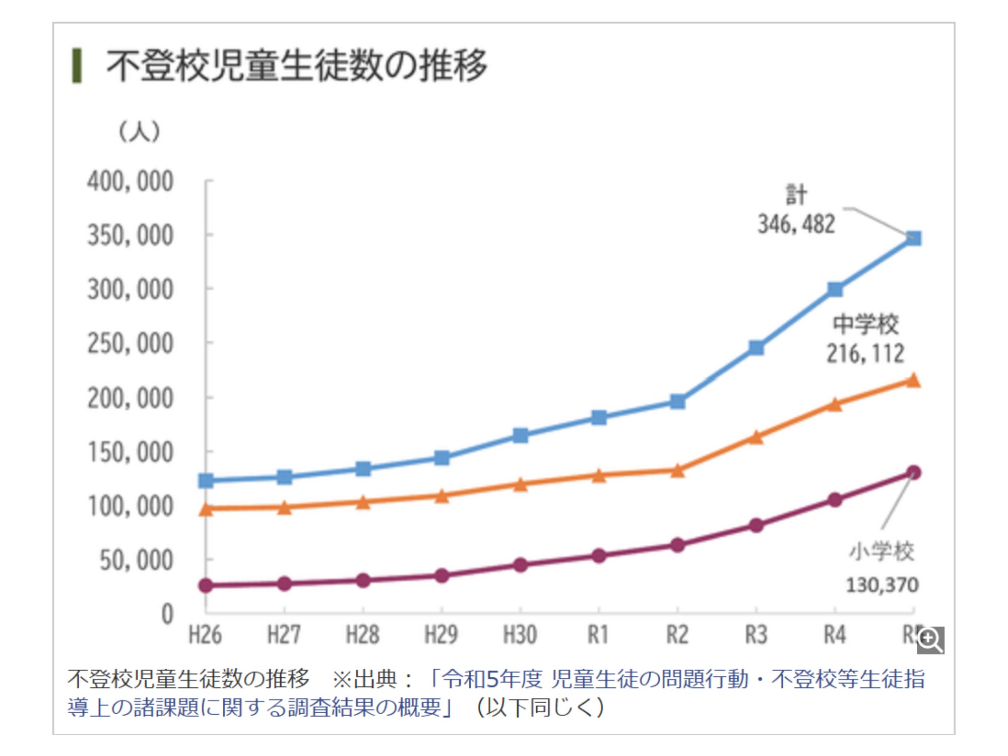 文部科学省に発表では昨年度の全国の小中学校で30日以上欠席した不登校の状態にある児童は34万6482人で、前年度と比較し4万7000人も増加しており、11年連続で増加しており過去最多の数字が出ております。