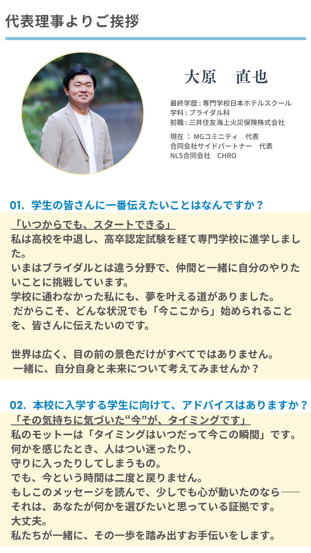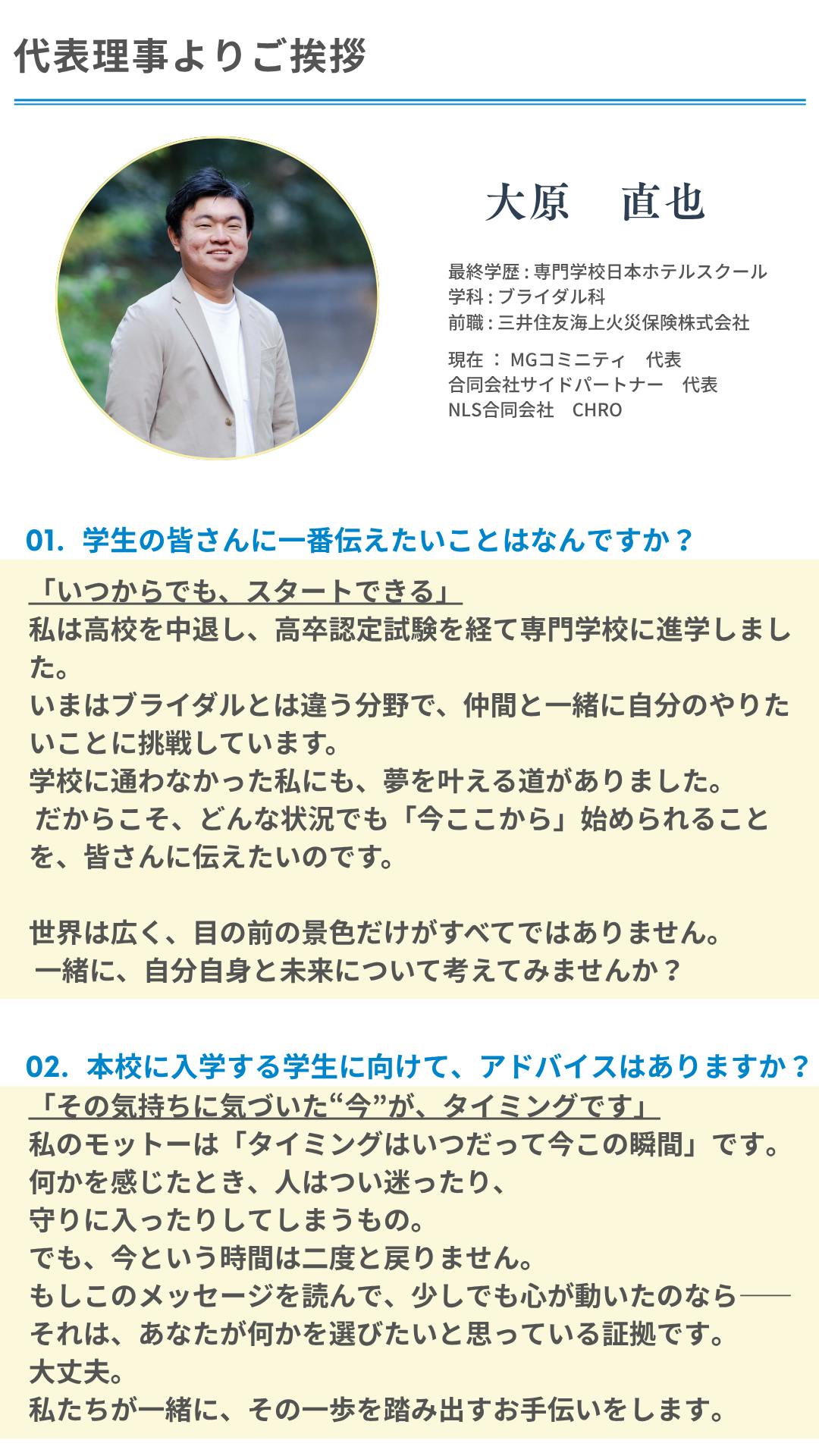本校を開校する決意をした理由は私の幼少期の家庭環境にあります。幼少期に受けていた父からの虐待や浮気現場との遭遇。両親の離婚とお金がなく高校を1年生でやめざるを得なくなり、私は正直”人生終わった”と思っていました。ですが高卒認定を取得し、4年間働いてお金を貯めて専門学校へ進学、前職は大手上場企業に務め、今では会社の代表、他社の人事の責任者を兼任しております。