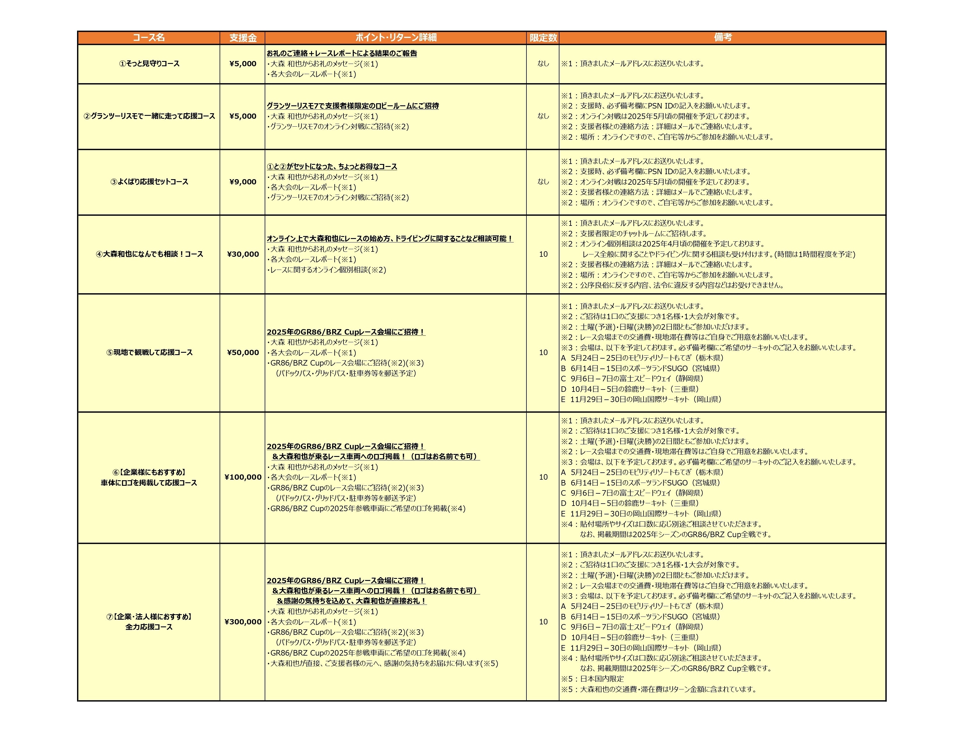 こちらをご支援いただいた方は、GR86/BRZ Cupのレース会場へのご招待と、大森和也が乗るレース車両へのロゴ掲載、感謝の気持ちを込めて直接のお礼をさせていただきます。(ロゴはお名前でも可)