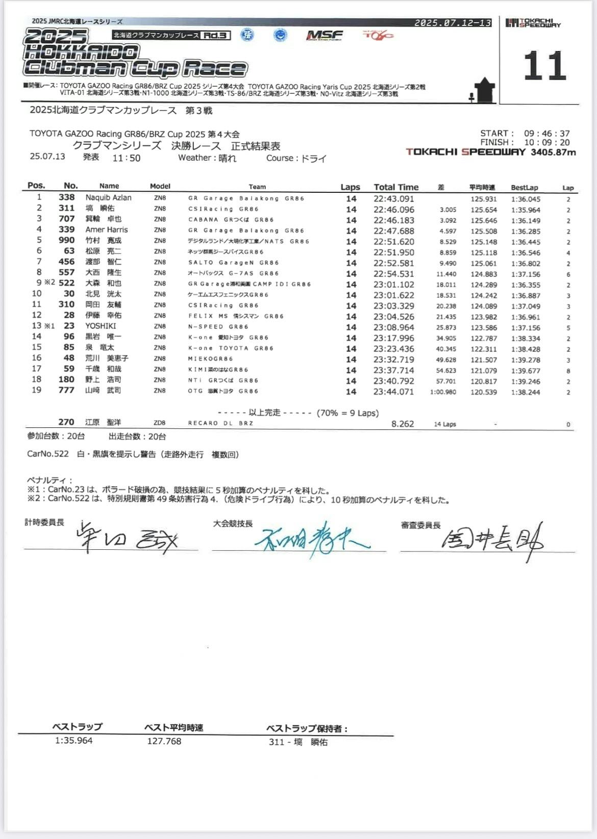 5位チェッカーでしたが、スタート直後の#339に対する僕の動きが妨害行為と判断されてしまい、レース後に10秒加算のタイムペナルティが科され、結果9位となってしまいました。