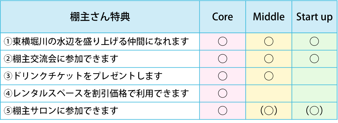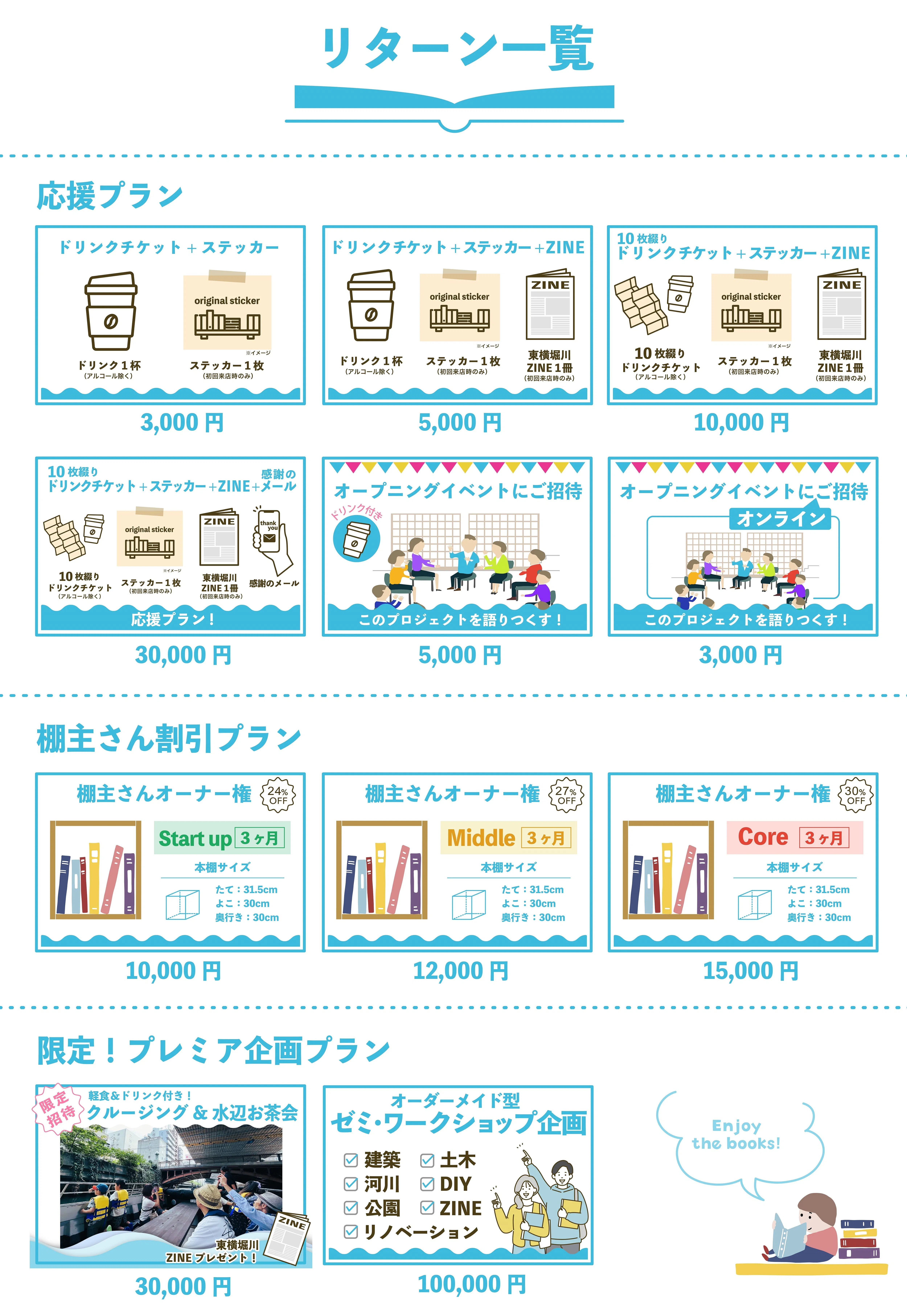 その他にも、カフェで使えるドリンクチケット、オリジナル冊子「東横堀川ZINE」、オープニングイベントご招待など様々なリターンをご用意しております。