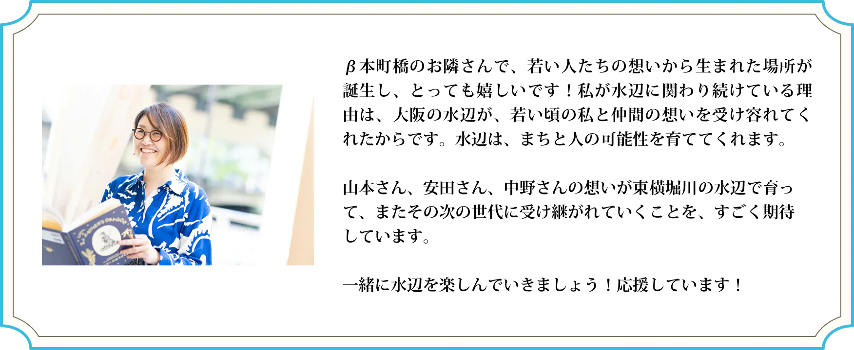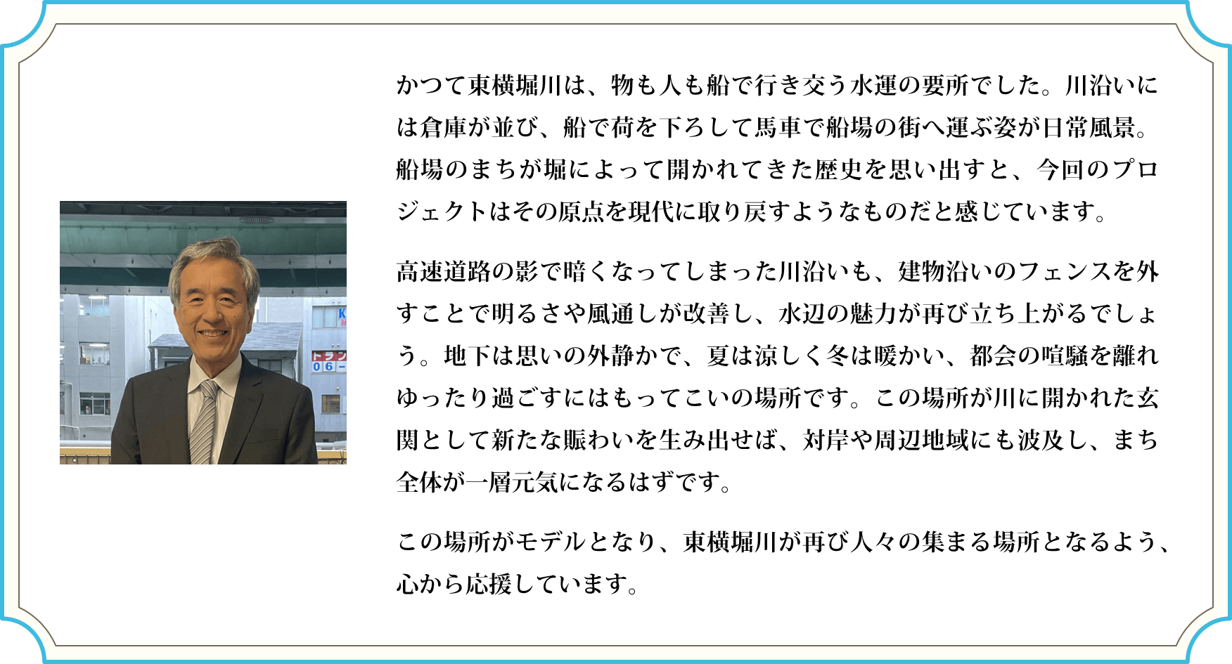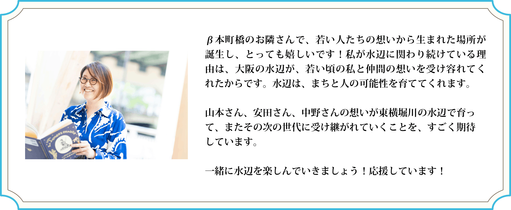 都会の喧騒から隠れた何とも言えない東横堀川の居心地の良さに惹かれ、この水辺をいい場所に変えていけるよう日々奔走しています。生活の一部として立ち寄りたくなるよう場所づくりを目指しています。